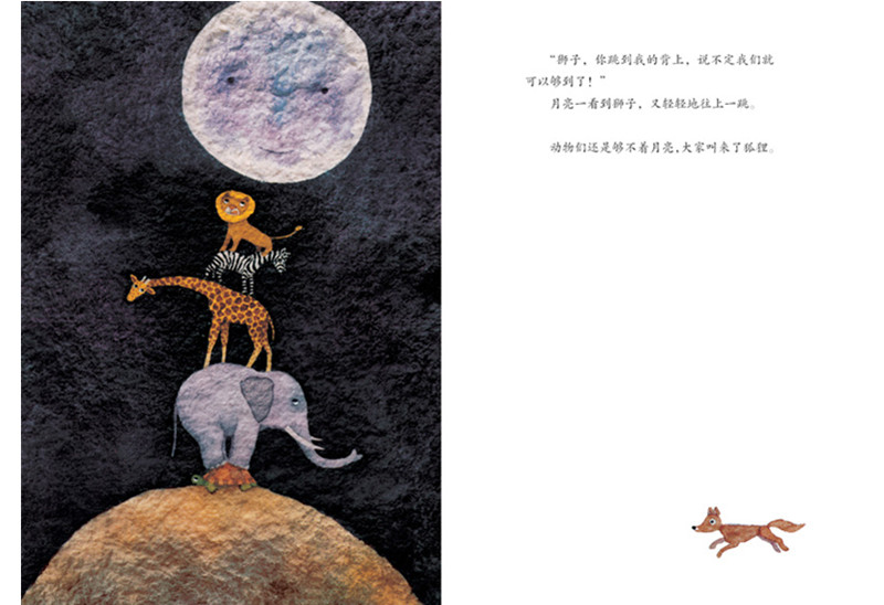 «Вкус луны»: Что такое вкус Луны?Я действительно хочу немного попробовать!Ночью животные смотрели на луну и всегда так думали.Однако, независимо от того, как вы растянули шею, вытянули руки, вытянули ноги и не могли удержать луну.Однажды была полна решимости прикоснуться к луне.Но он не может.Черепаха назвала слон, слон назвал жирафа, затем жираф, называемый зеброй, зебра называется Льва, льва называется лисой, лиса называется обезьяной, а обезьяна называла мышью.Луна немного растягивается каждый раз, делая их неспособными.Однако на этот раз Луна посмотрела на мышь:“Такой маленький парень, определенно не может меня уловить.” на этот раз это не двигалось.Непредвиденный,“ нажмите!” мышь укусила следующую луну.Это дает животным укус луны, и все чувствуют, что луна такая же, как и то, что им нравится.