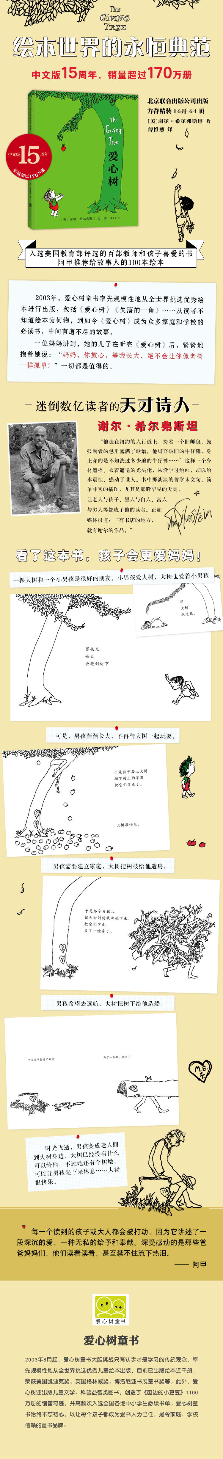 В 2003 году была опубликована китайская версия «дерева любви», и через 15 лет она стала обязательной для многих семей и школ.История между этим мальчиком и большим деревом заставила плакать бесчисленные читатели.Мать сказала, что, послушая «Люблю дерево», ее сын крепко обнял ее и сказала:&Ldquo;”