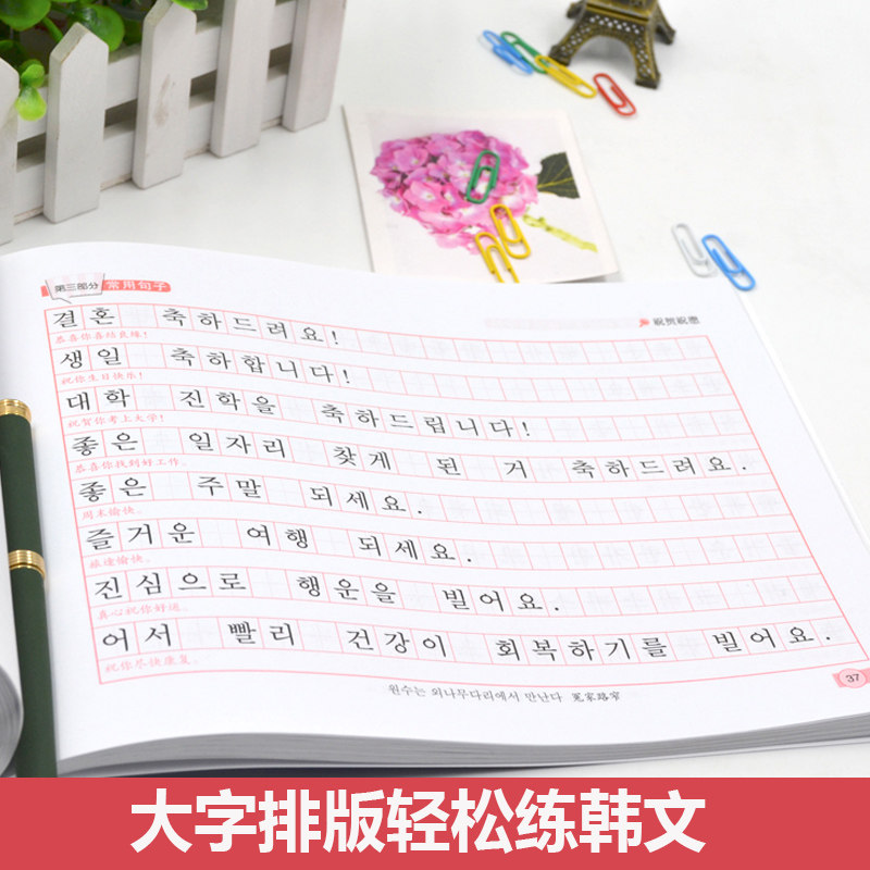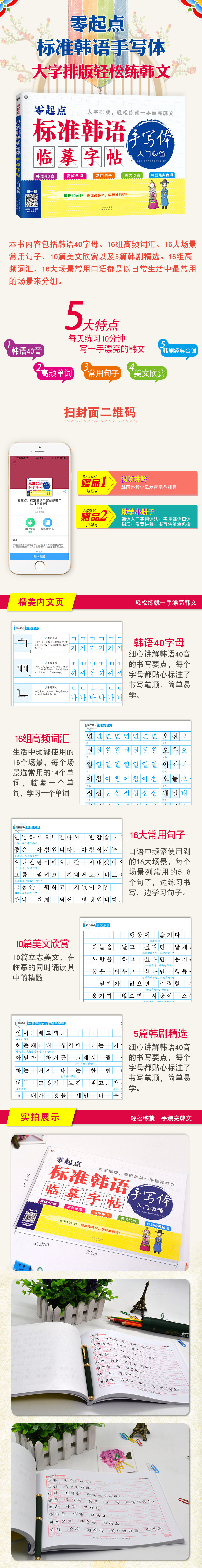«Основные возможности для начала работы с нулевой отправной точкой корейской пост -книги по написанию почерков» включают в себя 40 букв корейских, 16 групп высокого запаса словаря, 16 основных сцен, которые часто используют предложения, 10 красивых текстовых оценок и 5 корейских драм.Корейские 40 писем, изобретательно отмечали штрафную точку, которая может четко увидеть правильные инсульты, и тщательно объяснить пункты письма, чтобы учащиеся должны обратить внимание на содержание при написании.16 групп с высокой частотой словаря и 16 основных сцен обычно используются в повседневной жизни.Эта книга также поставляется с клавиатурными диаграммами, пальцами и видеоизоляционными видеороликами иностранного учителя.