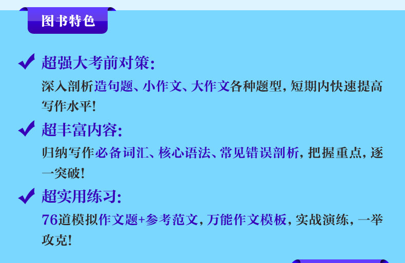 | "Полностью схватить&Middot;Обратите внимание на метод: хотя тема письма Топика трудно предсказать, характеристики темы очень очевидны.Согласно характеристикам темы, идеи письма даются темам кандидатов, чтобы справиться с различными темами.Объяснение категории: в соответствии с типом вопроса о композиции Topik, оно разделено на три части: вопрос о предложении, небольшая композиция и большая композиция.Универсальная композиция: обеспечивает шаблон шедевра Топика.Упражнения и ответы: представлено большое количество упражнений на писательщики, справочных образцов и переводов.Общие ошибки в письменной форме: проанализируйте общие ошибки кандидатов в тесте Topik.Общие вопросы: суммируйте общие проблемы в отношении экзамена Topik. |