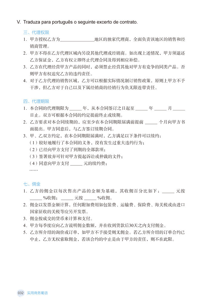 «Практический деловой португальский» содержит большое разнообразие деловых документов, и охватить их все в одном учебнике невозможно из-за его ограниченного объема. Таким образом, в этой книге для изучения выбрано только 8 типов документов, включая договоры о передаче прав на предпринимательство, договоры делового агентства, договоры на поставку, тендерную документацию, договоры проектного подряда, договоры международной перевозки, договоры хранения и хранения грузов, а также договоры франчайзинга.Принимая во внимание разницу между португальским и португальским языками, за исключением договора делового агентства и договора франчайзинга, поскольку второго подходящего текста найти не удалось, для остальных шести документов были выбраны португальский (в основном португальский или ангольский) текст и португальский текст.