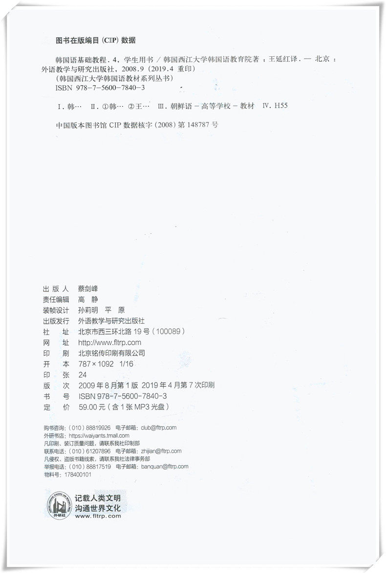 [Подлинное] Корейский базовый учебник Студент Книга 4 4 (включая CD) Корейский самооценка, прослушивание, чтение, чтение, чтение корейских словарных статей, слушающие институт иностранных исследований Университета Западного Цзяньго