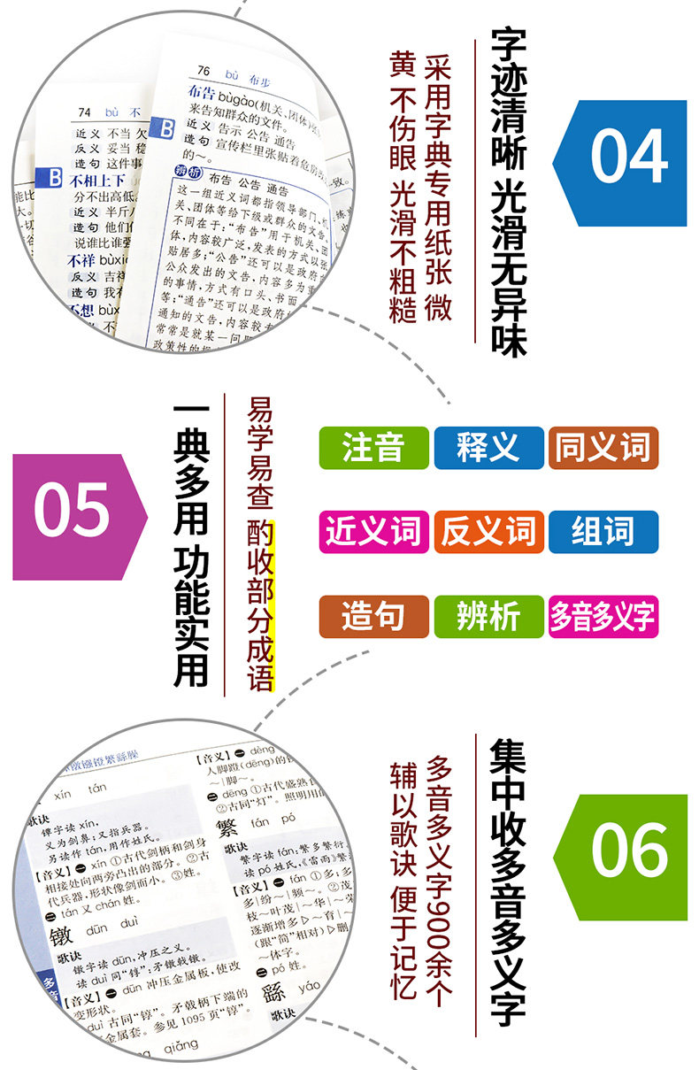 этот словарь основан на «таблице общих персонажей современных китайцев» и написан в соответствии с «полным 13 обязательным образованием китайских стандартов учебной программы». Контент начинается с фактических потребностей обучения студентов и внимательно следует за различными версиями китайских учебников в Китае.С точки зрения формы символа, формы слова, произношения, интерпретации, изготовления предложений и т. Д., Мы сосредоточены на отражении принципов науки и стандартизации.Редактор много раз проверял синонимы, синонимы и антонимы на основе текущих национальных языков и текстовых спецификаций, с целью позволить студентам понять значение и использование синонимов, синонимов и антонимов.Помогите студентам повысить точность выбора слов и изготовления предложений, их способность использовать слова и даже языковые приложения.