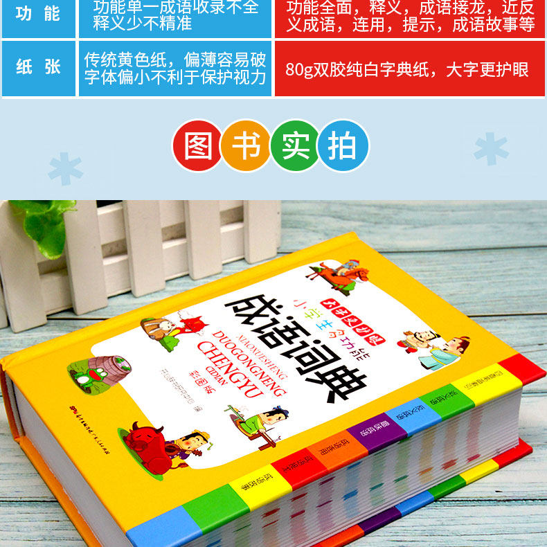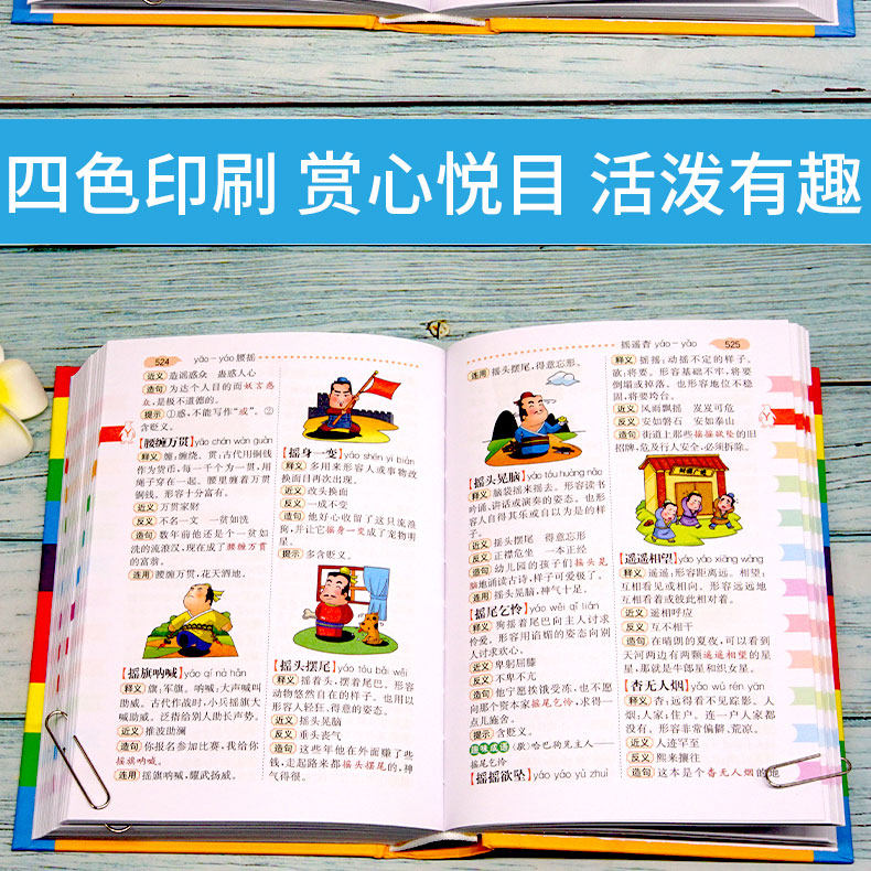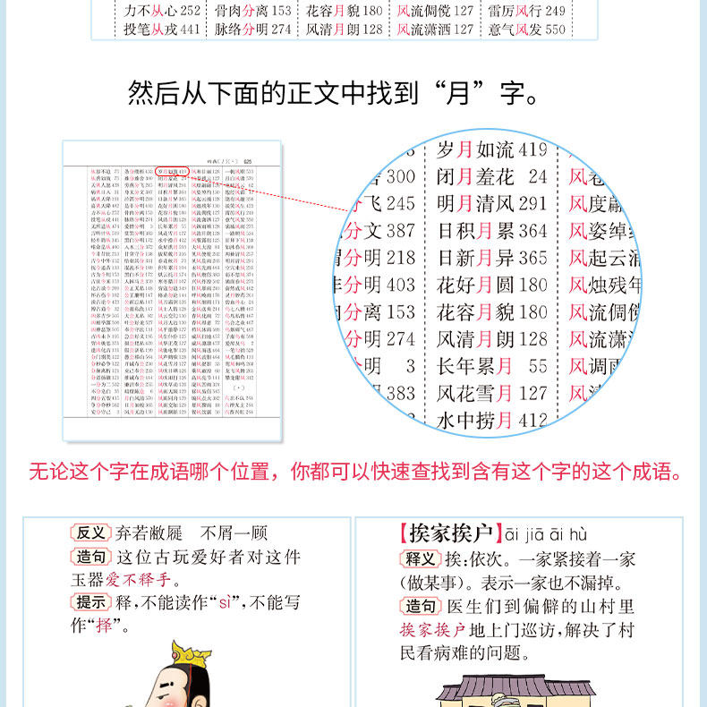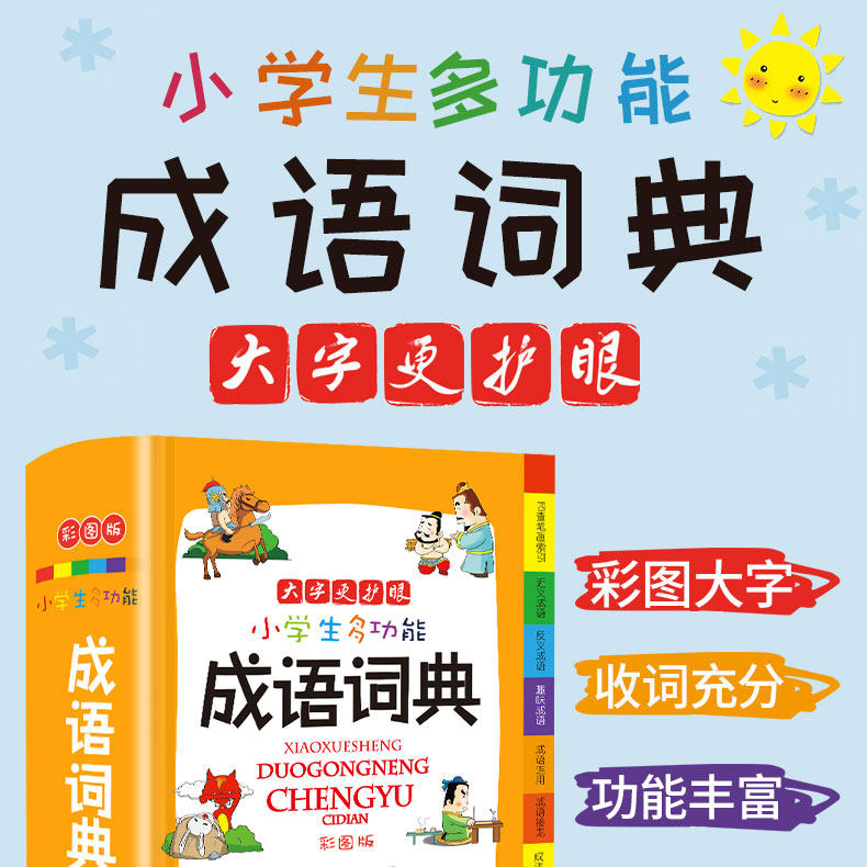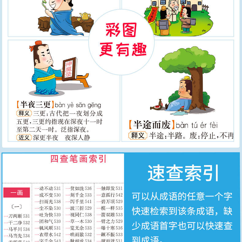 Многофункциональный словарь идиом быстрого поиска для читателей начальной школы.&Ldquo; четыре индекса проверки пера”Этот специальный индекс отвечает фактическим потребностям поиска читателей начальной школы. Он имеет более 10 функций, таких как фонетическая запись, определения, синонимы, антонимы, построение предложений, союзы, советы, интересные идиомы, пасьянс идиом, идиоматические истории и цветные иллюстрации, которые помогают читателям накапливать идиомы и улучшать их способность применять идиомы.