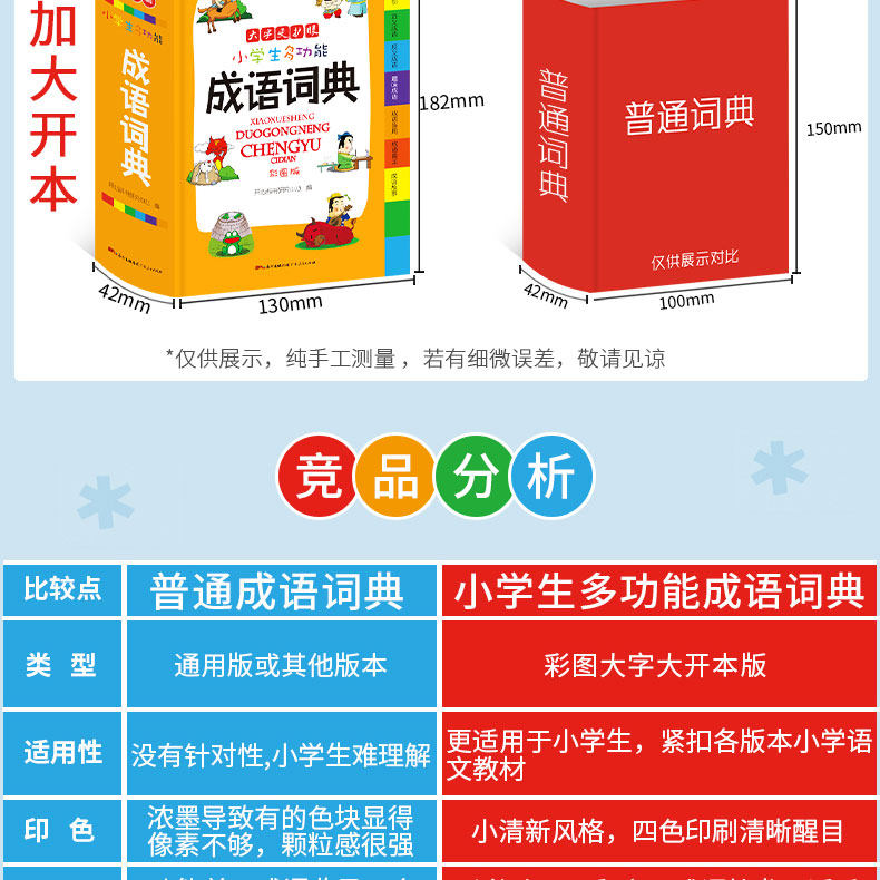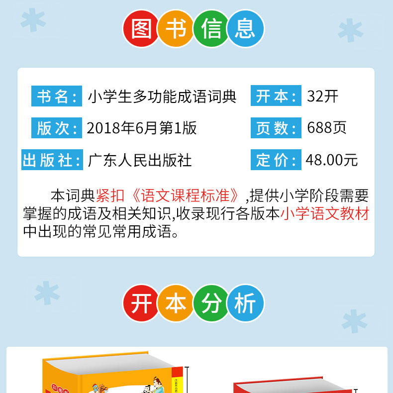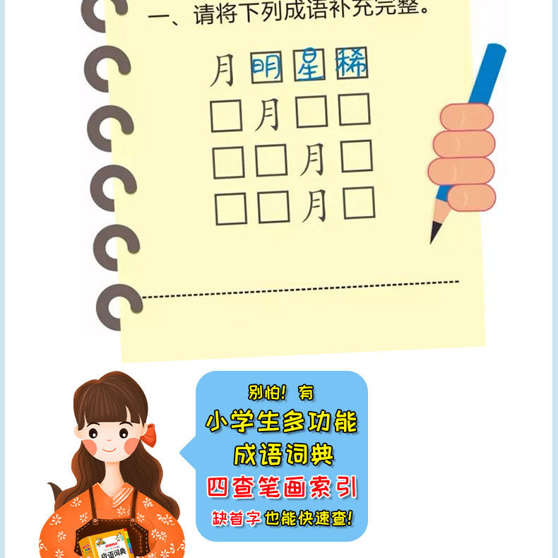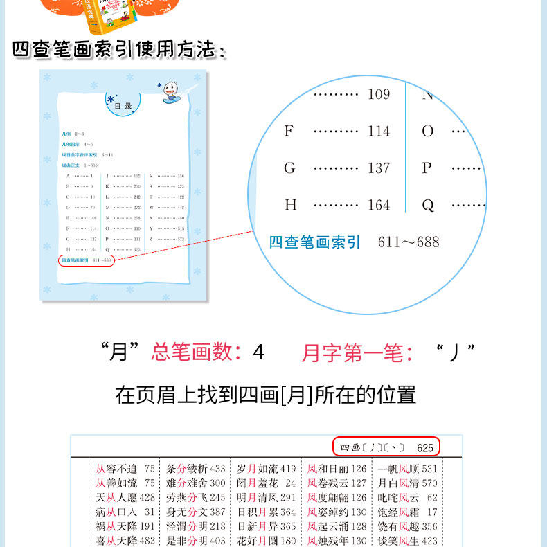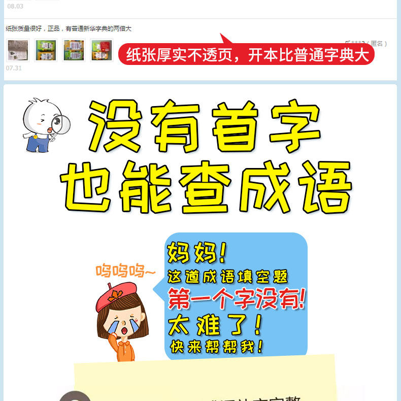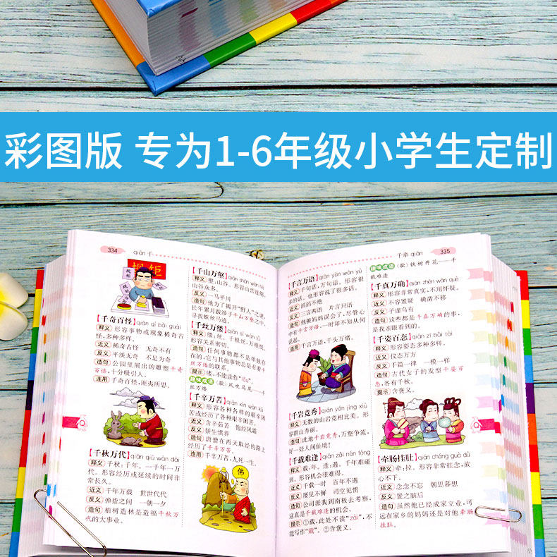 Многофункциональный словарь идиом быстрого поиска для читателей начальной школы.&Ldquo; четыре индекса проверки пера”Этот специальный индекс отвечает фактическим потребностям поиска читателей начальной школы. Он имеет более 10 функций, таких как фонетическая запись, определения, синонимы, антонимы, построение предложений, союзы, советы, интересные идиомы, пасьянс идиом, идиоматические истории и цветные иллюстрации, которые помогают читателям накапливать идиомы и улучшать их способность применять идиомы.