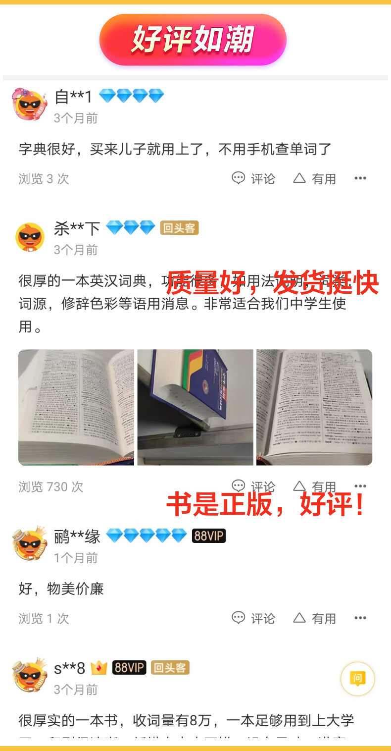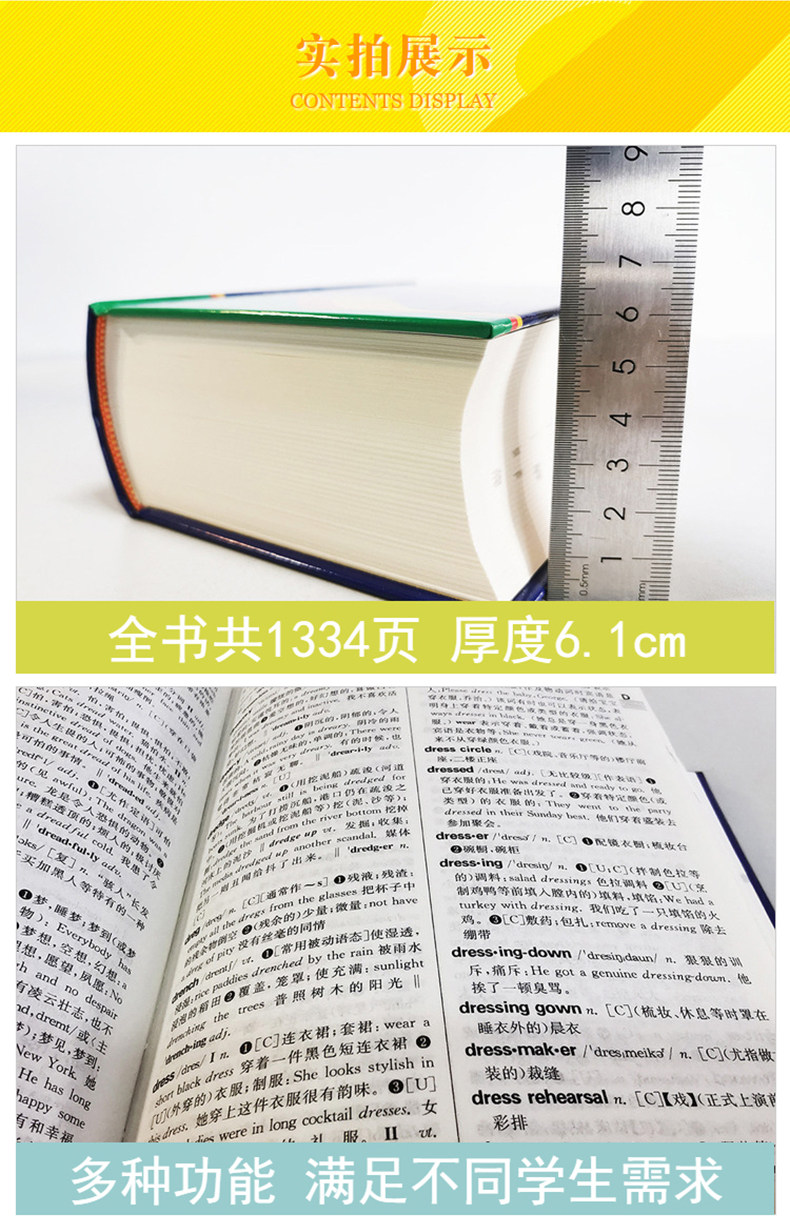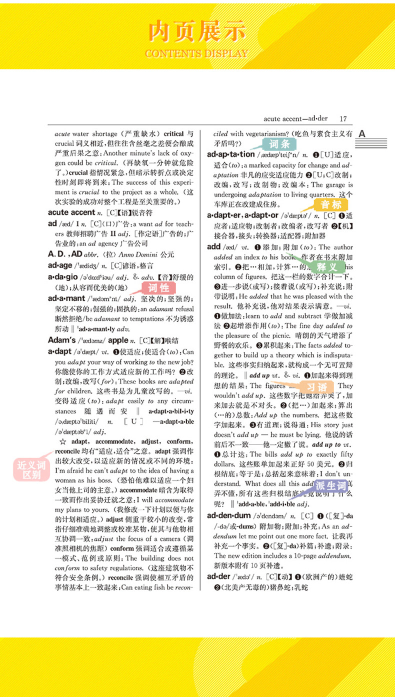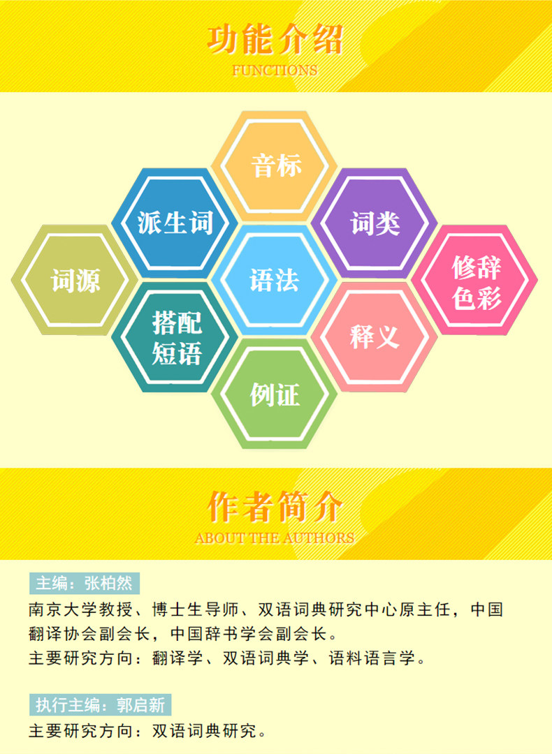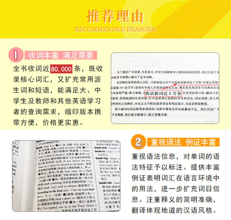 Этот словарь содержит почти 80 000 слов, которые не только включают в себя основные английские слова, но также расширяют обычно используемые производные слова и фразы, которые могут удовлетворить потребности учащихся университетов и средней школы, учителей и других изучающих английский язык. В ответ на практические трудности в обучении и использовании английского языка, словарь специально настроил столбцы с описанием использования и столбцы анализа синонимов для укрепления функции обучения. Этот словарь также уделяет особое внимание грамматической информации Word и добавляет множество советов к грамматическим характеристикам слов между основными линиями; Это указывает на категорию слов, этимологию, риторический цвет и другую дополнительную лингвистическую информацию записи, чтобы помочь читателям правильно сделать слова и предложения. Кроме того, словарь предоставляет богатые иллюстрации для иллюстрации использования словаря в среде локали, что еще больше расширяет информацию о словах.