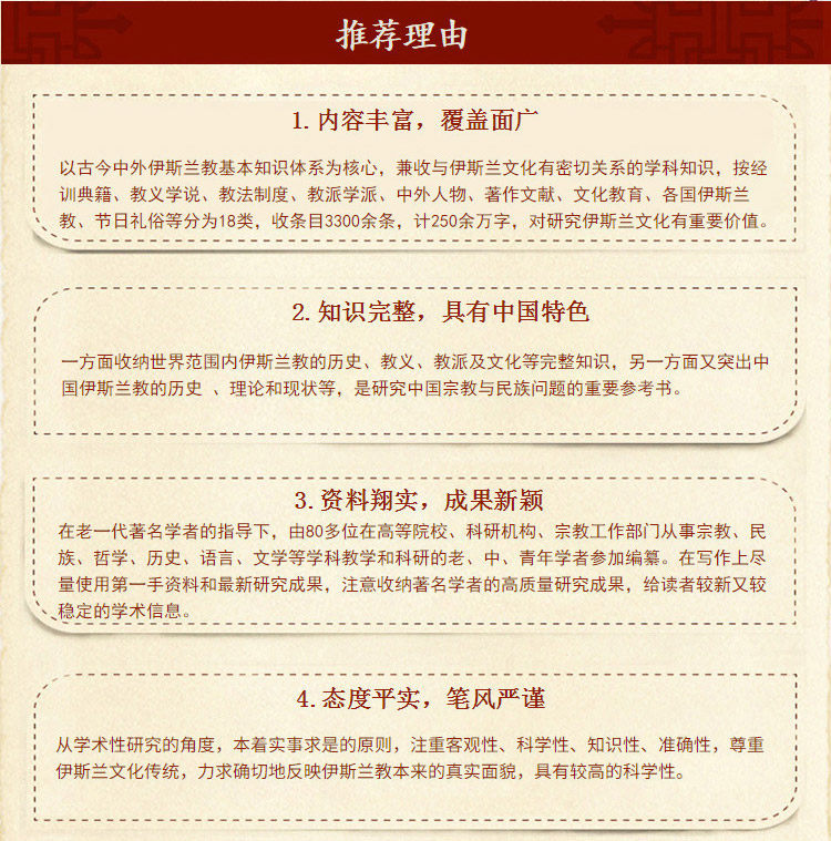 «Китай исламская энциклопедия» относится к общим случаям и опыту компиляции энциклопедии в современном мире и стремится быть кратким, полным и научным с точки зрения выбора ввода, системы структуры знаний, классификации входа, метода компиляции и поисковой системы ПолемОхват коллекции записей, как древних, так и современных китайских и иностранных, с базовой системой знаний об исламстве, а также предметных знаний, тесно связанных с Исламской культурой. ПолемВ соответствии с уровнем системы и структуры знаний этой дисциплины, книга создана на четырех категориях крупных, средних, маленьких и малых соответственно.Большие бары являются основным скелетом книги, который отражает системность, полноту и академичность знаний; иерархия и охват знаний отражают уровень знаний; бары отражают широкость и популярность знаний; пол.В различных записях есть очертания и глаза, вертикальные и горизонтальные, и дополняют друг друга.Основное содержание включает в себя историю и текущую ситуацию исламского общения и развития, основные убеждения, классику, доктрину и социальные мысли, системы преподавания и этикет, фракции и общественные организации, китайские и иностранные деятели, исторические вопросы, храмы и памятники святой земли и памятники,, Памятники, памятники, памятники, памятники и памятники и памятники, а также памятники, а также памятники, священные земельные храмы и памятники. Ислам и зоны распространения, культурное образование, основной мусульманский народ и общие термины и другие части различных стран.С точки зрения исламской культуры, религиозная дисциплина ислама, философия, этика, историческая, литература, искусство, искусство, архитектура, язык, текст, каллиграфия и различные естественные науки.Книга основана на истории и истории культуры и проходит через все виды записей.
