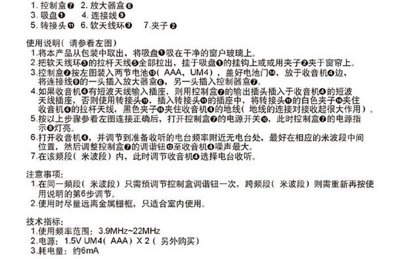 [ 和同一个收音机在不同地方、不同时间段收台的效果不同一样,外接天线效果也因各处信号环境不同而不同,而且和使用方法、技巧也有关系,需要买家有较强的使用水平。因此,请恕我们不保证外接天线的效果,购买前请买家多参考些网上相关评价。当然,如果是机器质量问题,请按后面售后服务栏目说明处理;非质量问题而无效果或效果欠佳请恕不退换。感谢您的理解、信任与支持!]