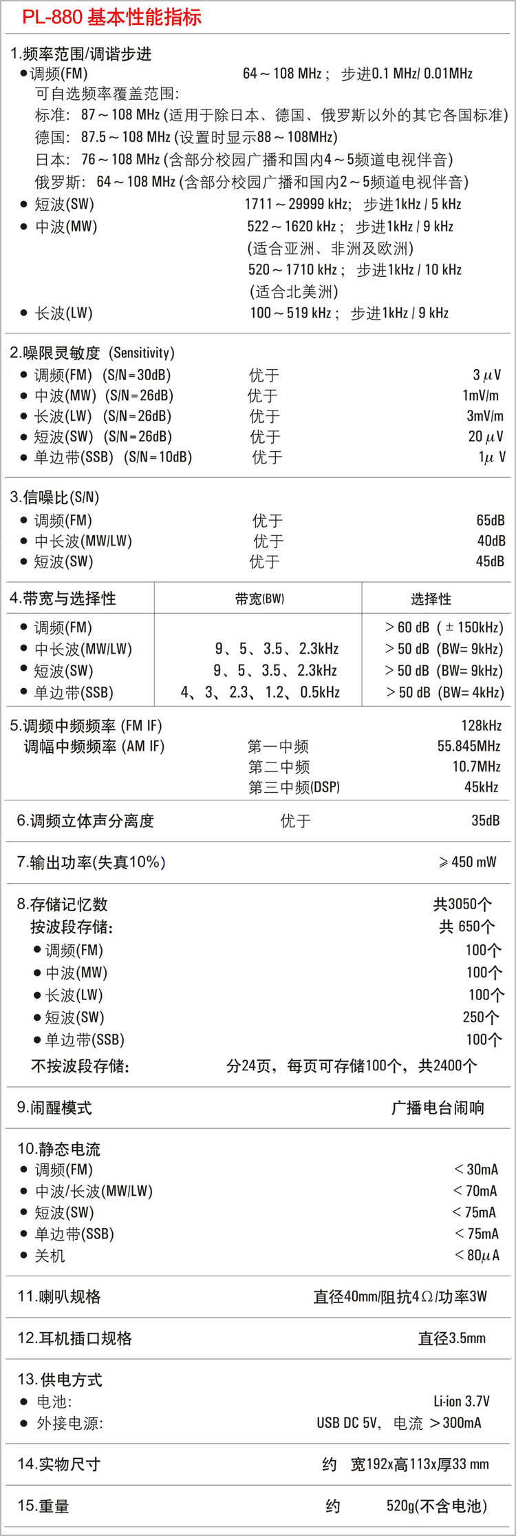 Цикл исследований и разработок PL-880 прошел через 2 года.По случаю списка продуктов мы также благодарим друзей и экспертов, которые снова участвовали в тесте дома и за границей!Спасибо за тщательное и тщательное тестирование продуктов, и выдвинули много ценных мнений и предложений.Из-за вас PL-880 завершенГосударство на рынке. PL-880-это высокопроизводительный полнополовный стереомолдинг-продукт для цифровой настройки. Он принимает многократное преобразование частоты, моделирование высвобождения средней школы и технология DSP цифровой демодуляции. Сигнал, быстрый и медленный двойной дизайн и используйте полную частоту оратор.Это радио с отличной производительности, богатыми функциями, простыми операциями и красивым тоном может удовлетворить ваши потребности в прослушивании глобального вещания и любительского радио.