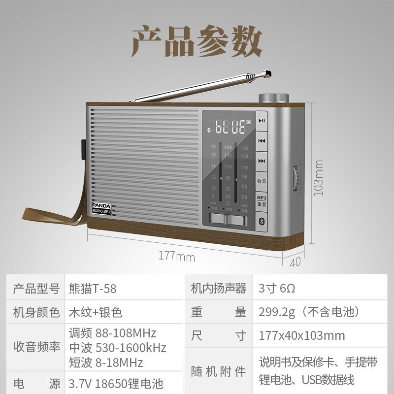 Panda T-58 Новый полнопользовый радиоподавляющий пожилой пожилой пожилой FM Semiconductor пожилой ретро Bluetooth