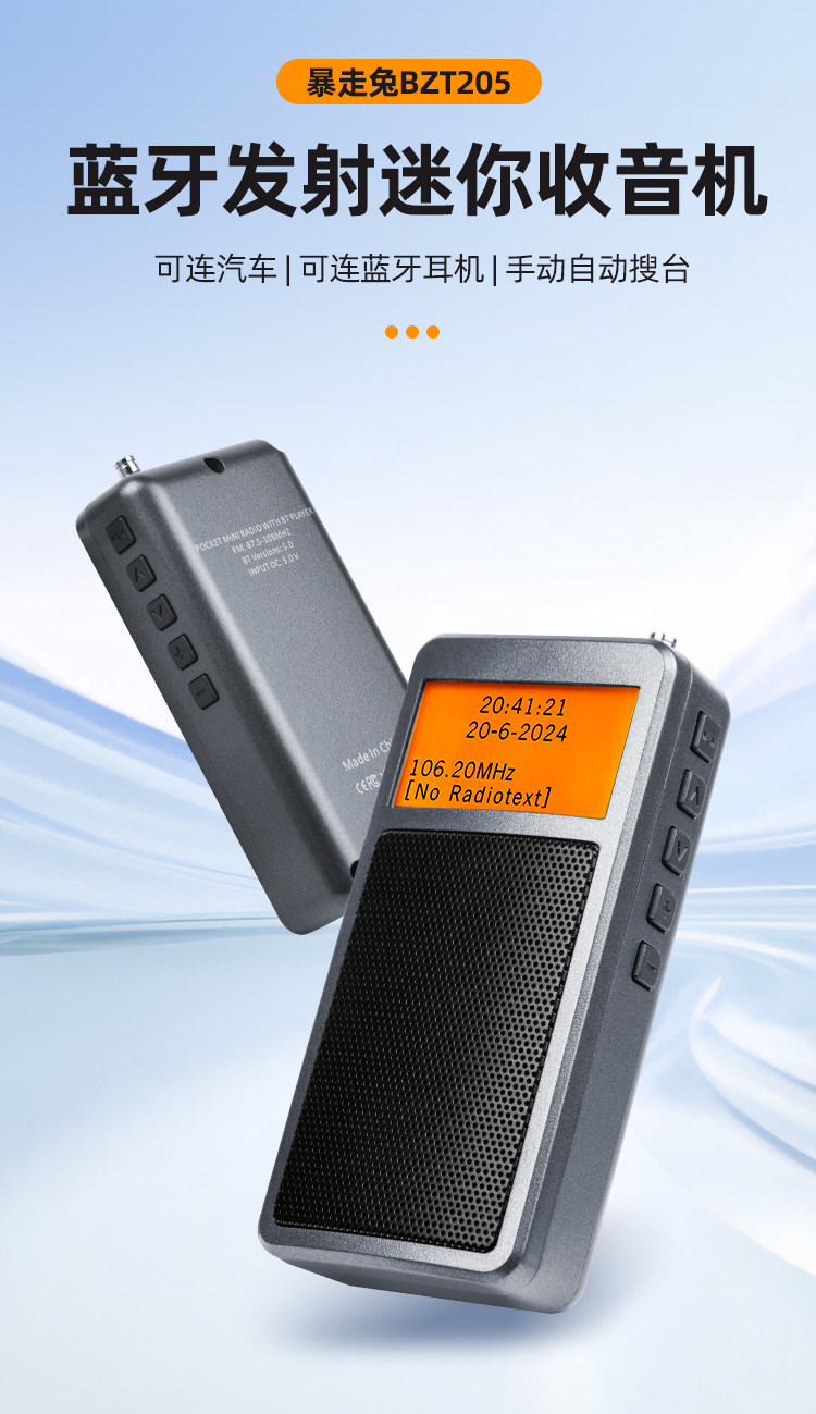 暴走兔 BZT205 Bluetooth-передатчик портативного FM-радио можно подключить к наушникам для использования в мини-автомобиле