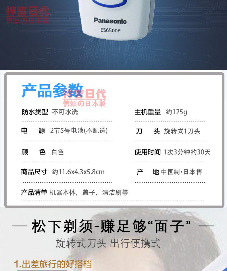 Япония импортировал Panasonic Panasonic Shaver Shaver Sword Men's ES6500P-W Electric Scraping rocting One Head
