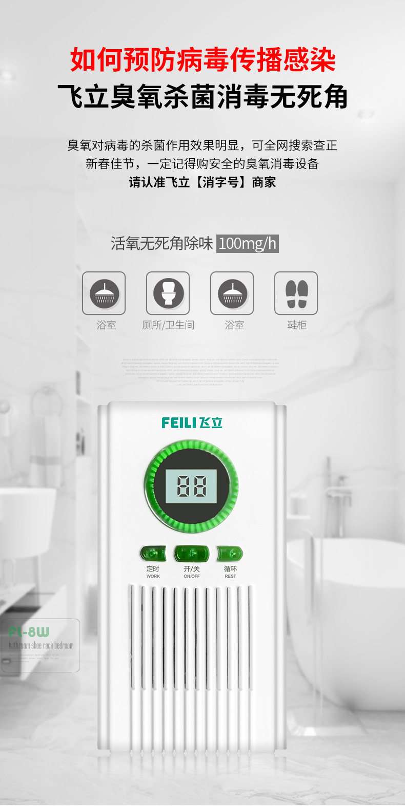 飞立 Машина озонового дезинфекции домохозяйственное генератор Озонового генератора туалетного очистителя Удаление Запах Удаление формальдегидного дымового аромата