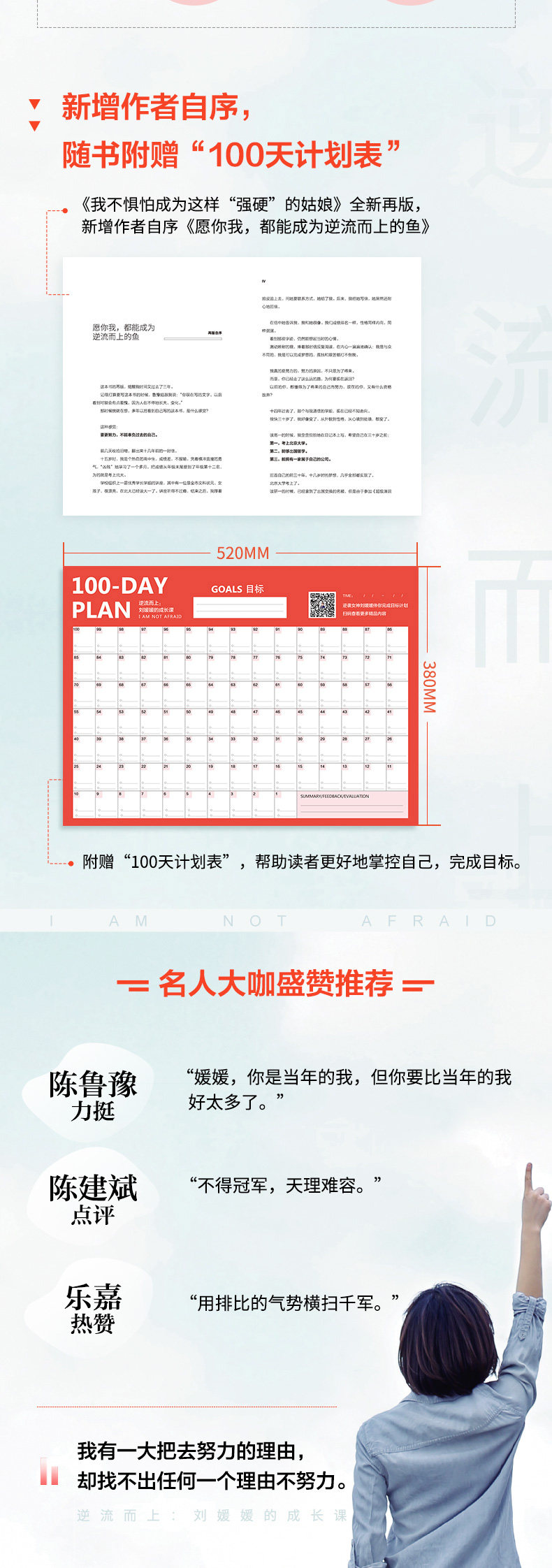 "Я не боюсь быть таким“ жесткий&«Девочка» переиздается заново с новым авторским предисловием «Пусть мы с тобой оба станем рыбами, плывущими против течения». Расположение более иерархичное и четкое, что значительно улучшает впечатления от чтения.Поставляется в комплекте с книгой.&«100-дневный план»”, чтобы помочь читателям лучше контролировать себя и достигать своих целей.
