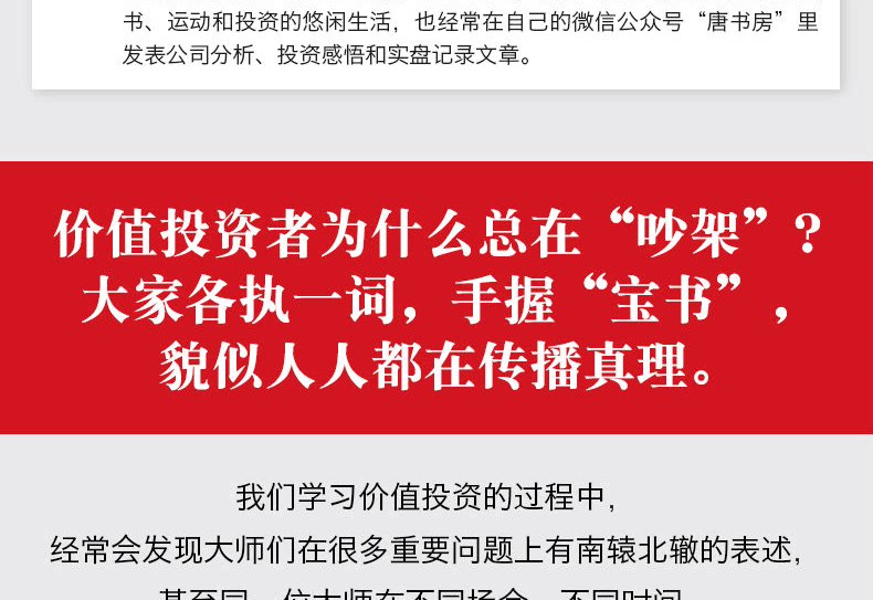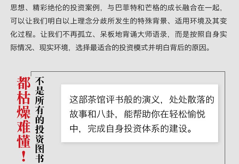 Первые две главы изложили все понимание личного понимания Лао Танга об инвестициях. Основная рамка заключается в самоотверженном разделе инвестиционных мастеров, представленных Грэмом и Баффетом на протяжении десятилетий.Вклад Лаос Тан в основном основан на его собственном понимании и практике. На простых и легких языках идеологическая система мастера превращается в текст, который можно понять любому читателю с культурой средней школы.После достижения читателя, чтобы прочитать его, полностью понять логику, и условия, необходимые для инвестиций в стоимость, должны быть прибыльными, и полностью отменить страх колебаний цен на акции, особенно колебания нисходящих.
