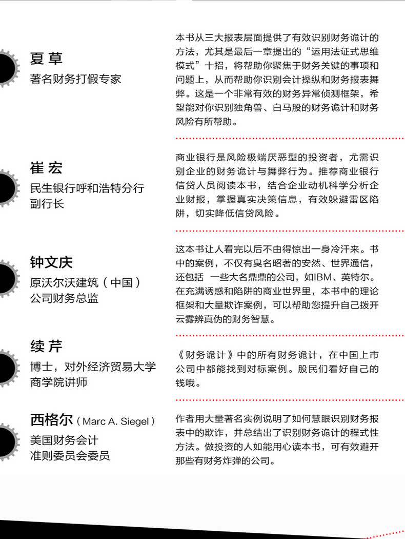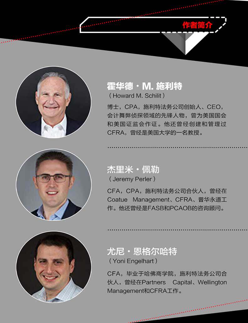 | Говард&Middot; M. Schilit Доктор философии, CPA, основатель и генеральный директор юридической фирмы Schlitt, пионера в области выявления мошенничества в бухгалтерском учете, давал показания в Конгрессе США и Комиссии по регулированию ценных бумаг США.Он также основал и управлял CFRA и был профессором Американского университета. Джереми&Middot; Джереми Перлер CFA, CPA, партнер юридической фирмы «Шлитт», когда-то работал в компаниях Coatue Management, CFRA, PricewaterhouseCoopers.Он также работал консультантом FASB и PCAOB. Юни&Миддот; Йони Энгельхарт CFA, окончил Гарвардскую школу бизнеса, партнер юридической фирмы Schlitt, когда-то работал в Partners Capital, Wellington Management и CFRA. Введение в переводчик Обновлять Доктор, в настоящее время преподавал в бизнес -школе Университета иностранной экономики и торговли, окончил бизнес -школу Китайского университета Ренмина.Обучите студентов бакалавриата, MPACC, MBA и студентов -JOB для обучения курсам, таким как финансовый учет, анализ финансовой отчетности и другие курсы.Добро пожаловать на обмен: emailxuqin@sina.com Чэнь Бинхан Степень магистра, окончила Школу бухгалтерского учета, Шанхайский университет финансов и экономики.Китай сертифицированные государственные бухгалтеры (CPA) и британская франшиза, сертифицированные государственные бухгалтеры (ACCA).В настоящее время он работал в министерстве инвестиционных банковских услуг Everbright Securities и имеет многолетний опыт работы в области IPO.Добро пожаловать на обмен: jerrybhchan@outlook.com Ши Мэйхуа В настоящее время энтузиасты пишут в Издательском доме машинного индустрии и несут ответственность за планирование и публикацию финансовых книг.Однажды занялся финансами и рекламой.Добро пожаловать на обмен: 1051594646@qq.com Ван Чжаоруй Степень магистра, в настоящее время занимал должность финансового отделения Unicom System Integration Co., Ltd., отвечает за отчетность, бюджет, финансовый анализ и другие задачи.Добро пожаловать на обмен: 1017561395@qq.com |