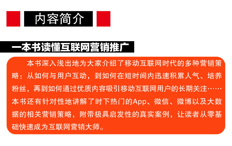 Эта книга“”“&rdquo“&Начиная с нового мышления мобильного интернет -маркетинга, я буду простым внедрением маркетинговых стратегий в эпоху мобильного интернета: от того, как взаимодействовать с пользователями, как быстро накапливать популярность, культивировать фанатов за короткое время и как Чтобы перенести высококачественный контент к тому, как передавать высококачественное контент длительное внимание для привлечения пользователей мобильного интернета……В этой книге также подробно объясняются маркетинговые стратегии, связанные с популярными приложениями, WeChat, Weibo и большими данными, а также приводятся очень вдохновляющие реальные случаи, позволяющие читателям быстро стать мастерами интернет-маркетинга с нуля.