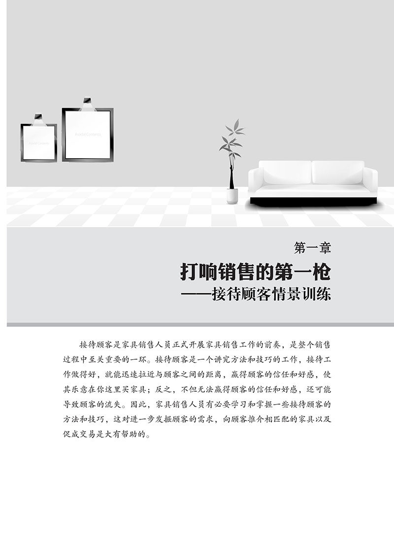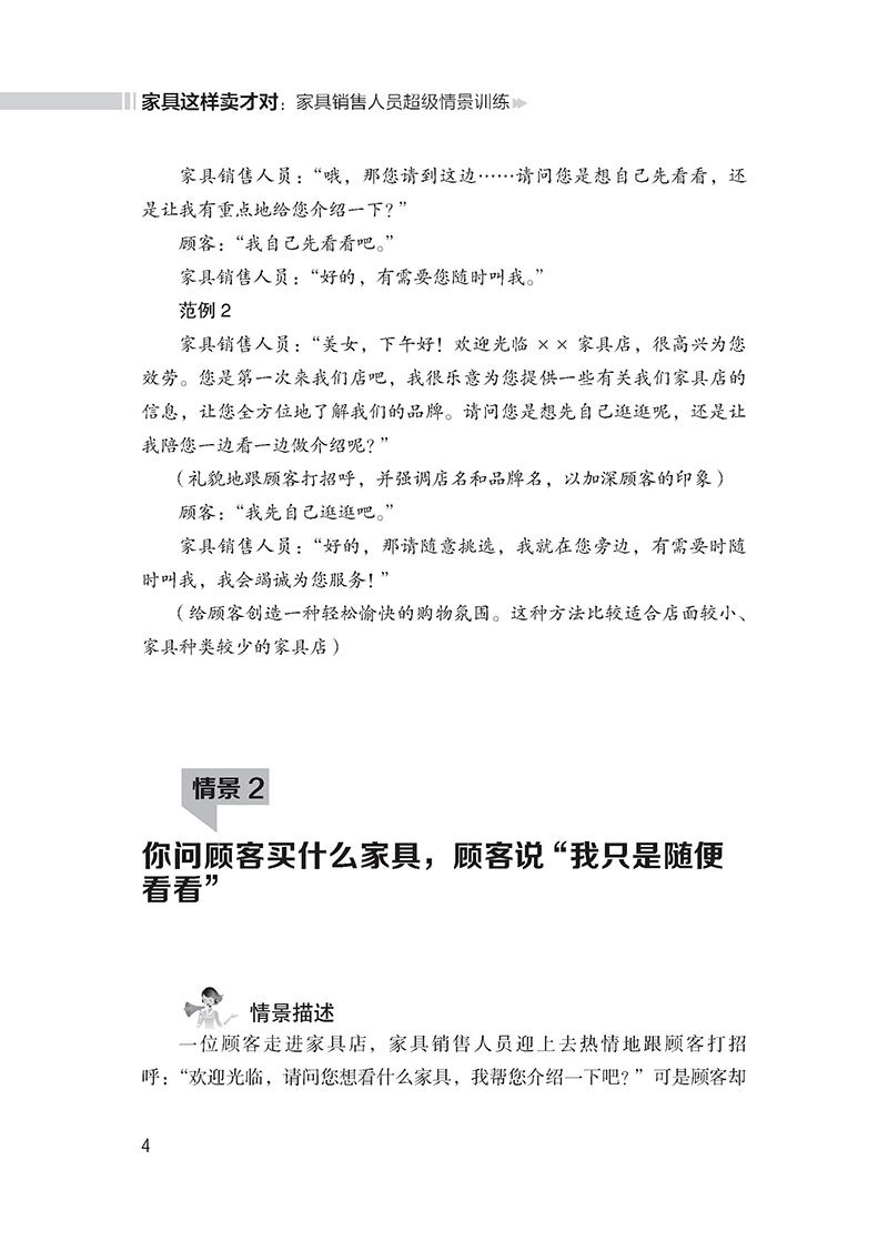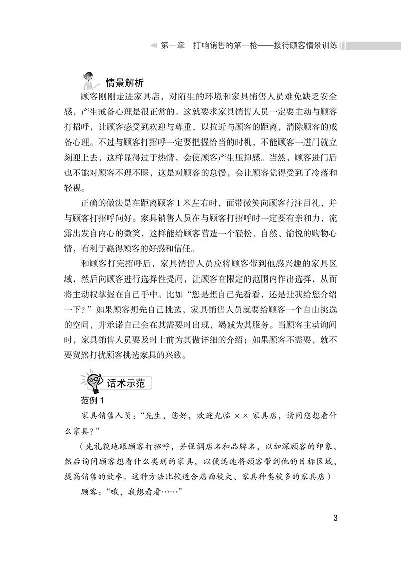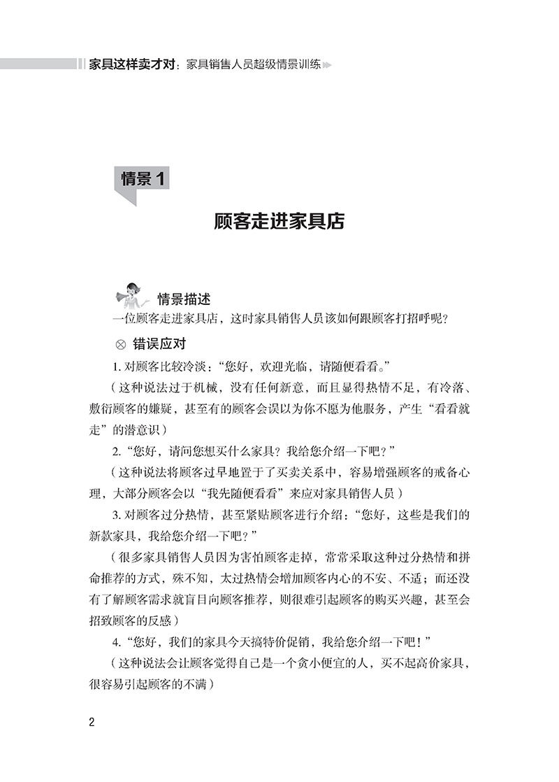 Глава 1 Первый снимок продаж——Получение клиентов - это работа и навыки. Также приводят к потере клиентов.Таким образом, для продажи мебели необходимо изучать и освоить некоторые методы и методы для получения клиентов, это очень полезно для дальнейшего обнаружения потребностей клиентов, для продвижения мебели, которая совпадает с клиентами.Сценарий 1 клиент входит в сцену мебельного магазина, описывающая клиента, чтобы войти в мебельный магазин.Ответ об ошибке 1. Calcorn для клиентов:&Привет, LDQUO;&Rdquo;“&Rdquo;&Ldquo;Позвольте мне представить вас, верно?&Rdquo;“”&Привет, LDQUO;&Rdquo;&Ldquo;&Rdquo; Чтобы произвести блюдную психологию.Это требует, чтобы персонал по продажам мебели должен был принять инициативу, чтобы поздороваться с клиентами, чтобы клиенты могли чувствовать себя желанными и уважать, чтобы приблизиться к клиентам и устранить психологию предупреждения клиентов.Тем не менее, поздравление с клиентами должно понять правильное время, и клиент не может немедленно встретиться, как только дверь входит в дверь.Конечно, клиенты не могут игнорировать клиентов после входа в дверь.Правильный подход состоит в том, чтобы обратить внимание на клиента с улыбкой примерно в 1 метре от клиента и поздороваться с клиентом.Сотрудники по продажам мебели должны иметь близость, когда приветствуют клиентов, демонстрируя улыбку от сердца, чтобы он мог создать расслабленное, натуральное и приятное настроение для покупок для клиентов, что помогает завоевать пользу и доверие клиентов.Познакомившись с клиентом, сотрудники по продажам мебели должны привести клиента в область мебели, в которой он интересовается, а затем подать к клиенту выборочный вопрос, позвольте клиенту сделать выбор в пределах ограниченного диапазона, чтобы контролировать Инициатива в его собственных руках.например&Ldquo;&Rdquo;Когда клиенты активно спрашивают, сотрудники по продажам мебели должны своевременно выступать, чтобы подробно представить их;Демонстрация демонстрации диалога 1 продавца мебели:&Мистер LDQUO;×&Раз;” Для повышения эффективности продаж.“……&Rdquo;“…&Hellip;”&Ldquo;&Rdquo;&Ldquo;”&Ldquo;Добро пожаловать×&Раз;Вы впервые приехали в наш магазин.Вы хотите сначала пойти по магазинам или позволить мне сопровождать вас во время просмотра?”&Ldquo;&Rdquo;“&Rdquo;“”“”
