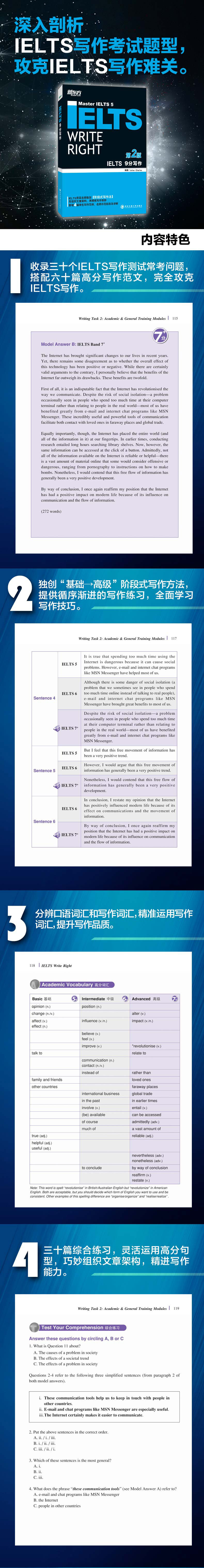 «IELTS 9 очков» (Второе издание) готово для кандидатов, которые хотят получить высокие базы написания IELTS.В этой книге анализируется задача 1 и задачи 2 точки академических категорий письма и обучения IELTS.Каждый из каждого типа вопроса предоставляет две модели письма, одна из которых представляет собой эссе с высокой оценкой.&Ldquo; демонстрация шаблона предложения&Rdquo; приведен примеры предложений 5 баллов, 6 баллов и 7 баллов выше, а кандидаты направляют высокие предложения.&Ldquo; словарный запас высокой оценки&Rdquo; суммирует фонд, промежуточный и продвинутый словарный запас, чтобы помочь кандидатам изучать и использовать словарный запас высокого уровня.&Ldquo; комплексные упражнения” Помогите кандидатам овладеть фокусом написания эссе и научиться организовать статьи, практиковать грамматику и научиться писать словарный запас.Кроме того, эта версия добавляет расширенные навыки на основе первого издания, добавляя 4 новых студенческих эссе и исправлено старшим учителем IELTS. Кандидаты могут учиться для справки.