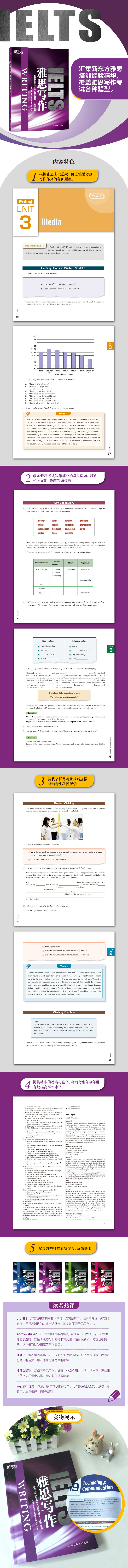 Всего в книге 20 разделов, всесторонне охватывающих различные типы вопросов письменной части теста IELTS. Он включает в себя общие темы письменной части теста IELTS.В каждом модуле также обобщается связанная лексика, обобщаются знания грамматики и подробно описываются методы решения проблем.Он не только предоставляет разнообразные упражнения и советы, которые помогут кандидатам эффективно подготовиться к экзамену;он также предоставляет образцы эссе для эффективного улучшения навыков письма кандидатов.