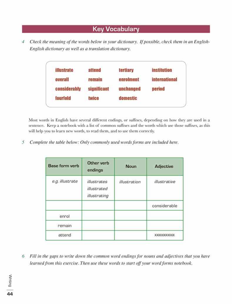 Специальный словарный запас предназначен для Задания 1, чтобы вы могли писать о данных, тенденциях и изменениях. Кроме того, представлена типичная лексика, связанная с общими темами Задания 2.