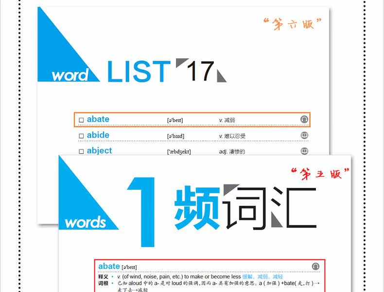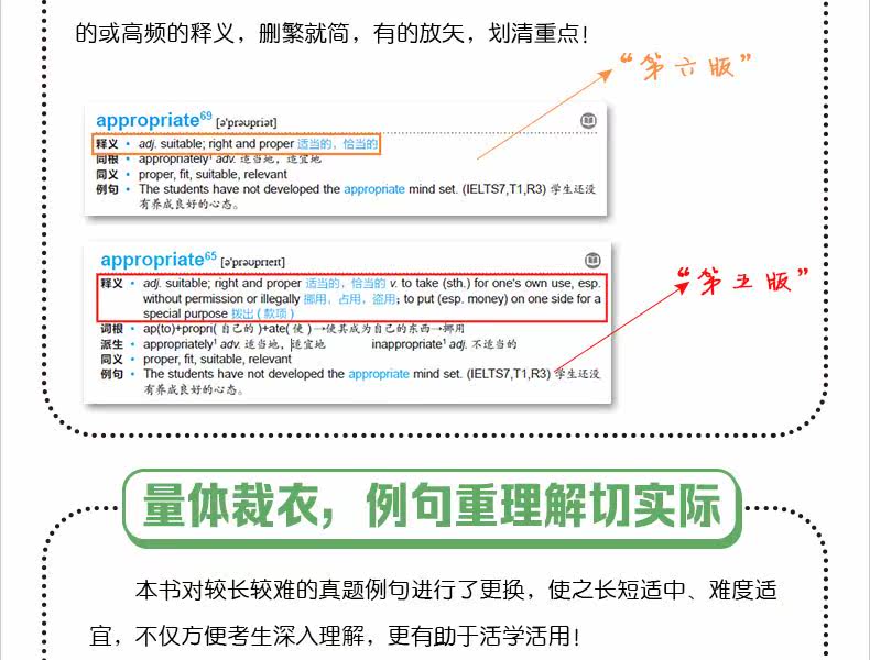 В дополнение к словарному запасу частоты 1 все основные статьи, включенные в эту книгу, снабжены определениями на китайском и английском языках, а часть речи и значение каждой статьи сопровождаются примерами кембриджских экзаменов.По сравнению с 5-м изданием, в этом издании мы соответствующим образом удалили значения каждой основной записи, сохранив только те значения, которые фигурировали в реальных вопросах или часто используются, что значительно снижает нагрузку на кандидатов; в то же время мы также заменили более длинные и сложные реальные тестовые примеры, сделав их средней длины и сложности.1 Часто встречающиеся слова встречаются реже и имеют меньшую справочную ценность. Чтобы снизить нагрузку на кандидатов, мы удалили соответствующие примеры и сохранили смысл только для читателей, у которых есть свободные способности к обучению.