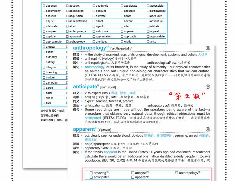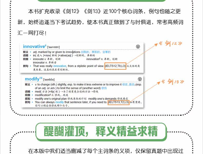 Избранный основной словарный запас для аудирования, разговорной речи, чтения и письма IELTS, сопровождаемый реальными тестовыми вопросами [Примеры предложений] из «Сборника полноценных тестовых вопросов Cambridge IELTS» (3–13), дополненными аутентичным английским языком и точным китайским [Объяснение]; [Корень] [Синоним] [Антоним] [Ассоциация] [Происхождение] [Коллокация] совместная атака, чтобы сделать словарную память более эффективной“Правдивый и точный” напрямую“Истинный словарный запас”первоначальное намерение.