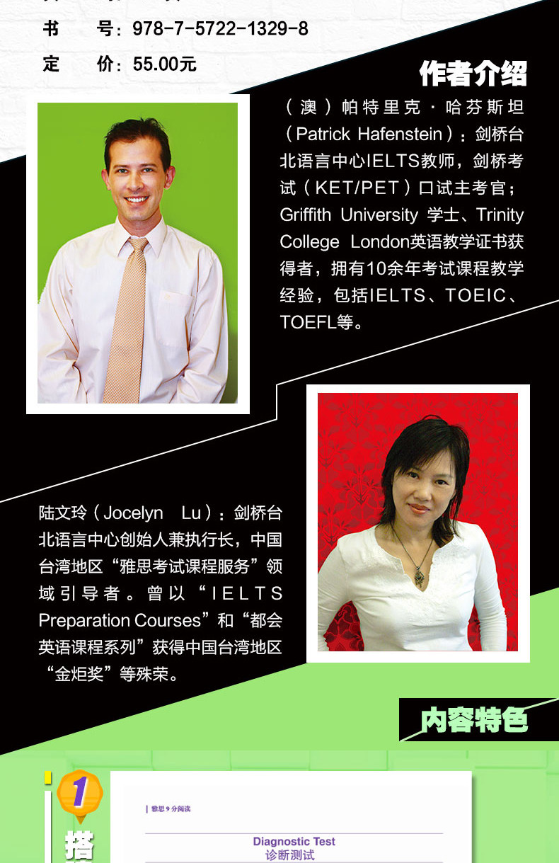 (Австралия) Патрик·Патрик Хафенштейн: преподаватель IELTS в языковом центре Кембриджа в Тайбэе, главный экзаменатор устного экзамена Кембриджского экзамена (KET/PET); Степень бакалавра Университета Гриффита, обладатель сертификата преподавателя английского языка в Тринити-колледже Лондона и более 10 лет опыта преподавания экзаменационных курсов, включая IELTS, TOEIC, TOEFL и т. д.