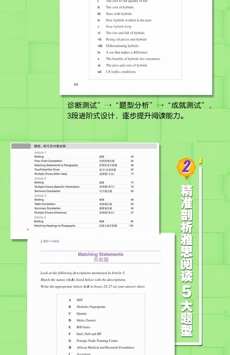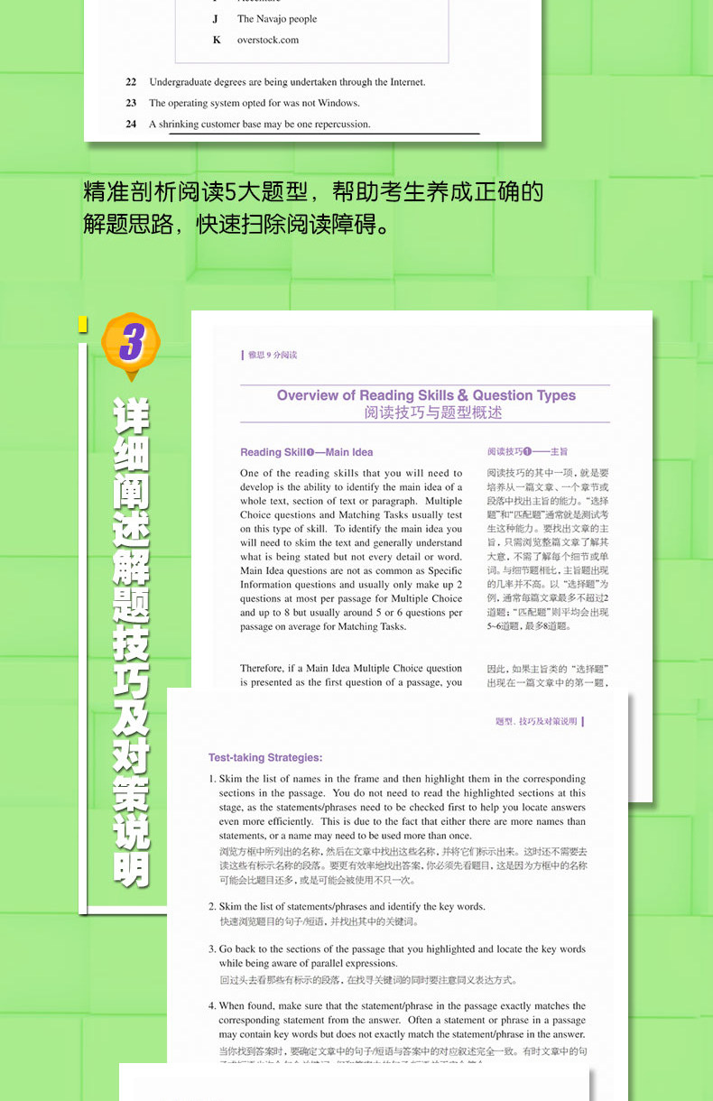 В этой книге анализируются типы вопросов IELTS для академического чтения и обучения чтению.“Введение в тесты по чтению и диагностические тесты”В этом разделе анализируются различные типы вопросов в разделе чтения IELTS и предоставляется основная информация о типах вопросов, такая как частота встречаемости в тесте, количество вопросов и т. д.“Описание типов вопросов, техник и стратегий”В нем частично анализируются все методы и типы вопросов, которые будут использоваться в тесте по чтению, а также представлены пошаговые стратегии решения проблем для различных типов вопросов.Книга включает в себя четыре полных набора вопросов для моделирования чтения, которые могут помочь кандидатам провести самопроверку после изучения содержания этой книги.*Последний“Необходимый словарный запас”Часть его включает номер страницы, фонетический символ, часть речи, определение на китайском языке и примеры предложений каждого слова, что облегчает кандидатам чтение, декламацию и запоминание.