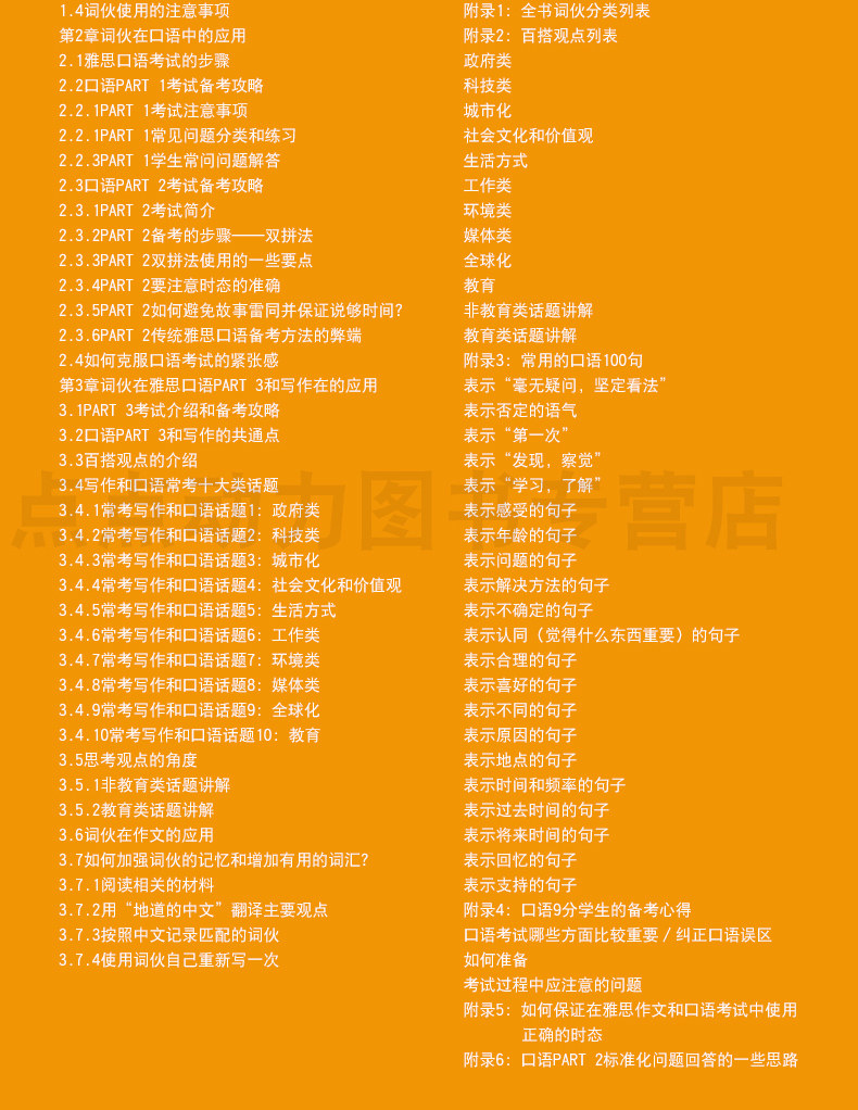 Эта книга включает в себяГлава 7 и 4 Приложение.Глава 1 является основным знанием поэта.Слово парня - это не слово, а фактическое применение словаря.Глава 2 - это применение поэта в IELTS Part 3 и писать, и полностью тренироваться в соответствии с Poly Guy в стандарте оценки теста IELTS.Глава 3 - это применение поэтов в композиции, которое направлено на то, как правильно ответить на задачу.Глава 4 Применение слов в устной части 1.Покажите языковой беглость.Глава 5 Приложение в прошлом 2 IELTS используется для полного решения темы темы, знакомого с темой и повышения эффективности подготовки к экзамену.Глава 6 - это применение поэтов на буквах класса G.Глава 7 Как убедиться, что напряжение композиции IELTS и разговор является правильным, это распространенная грамматическая проблема.Соответствовать требованиям грамматики в стандарте оценки.Приложение 1 - это список классификации книги, и кандидаты могут сосредоточиться на рассмотрении и просмотре.Приложение 2 - это список универсальных точек зрения, который помогает кандидатам просматривать общую ситуацию.Приложение 3 представляет собой 100 предложений для обычно используемых, и это необходимо.Приложение 4 -это тестовый опыт студентов, которые студентов -это стоит узнать от всех нас.Сущность