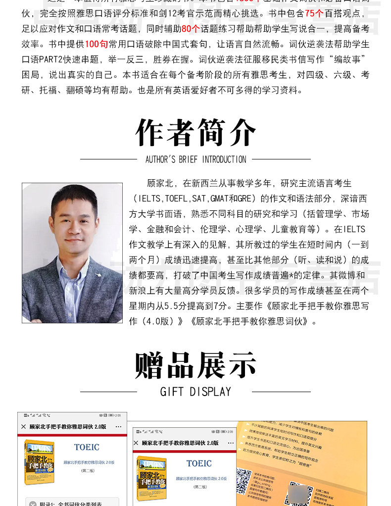 Гу Цзябеи много лет занимался преподаванием в Новой Зеландии.Композиция и грамматические части IELTS, TOEFL, SAT, GMAT и GRE) хорошо известны письменному языку Западного университета, знакомые с изучением и изучением различных предметов (включая управление, маркетинг, финансы и бухгалтерский учет, этика, психология, дети. образование и т. Д.У меня есть в курсе обучения композиции IELTS. законы.Существует большое количество отзывов студентов с высоким уровнем отзывов об их блогах Weibo и Sina.Многие студенческие оценки писания даже увеличились с 5,5 очков до 7 очков за две недели.Основные работы "Gu jiabei справляются с ручкой IELTS (версия 4.0)", "Gu Jiabei обрабатывает парня IELTS"Сущность