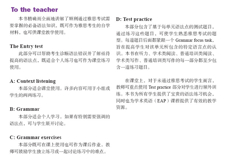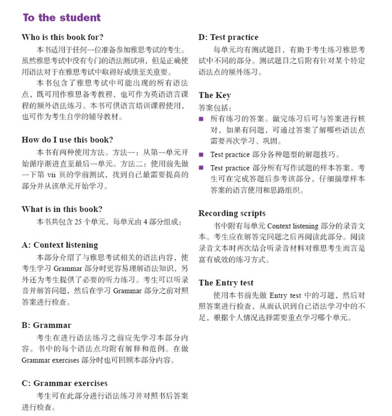 Британские эксперты IELTS Диана Хопкинс и Полин Каллен тщательно написал, чтобы проанализировать общий тест грамматики с неизвестным языком и реальным контекстом. объясняется и примеры, и каждое подразделение имеет тестовые вопросы, позволяющие кандидатам объединять теорию и практику для дальнейшей консолидации грамматических знаний;