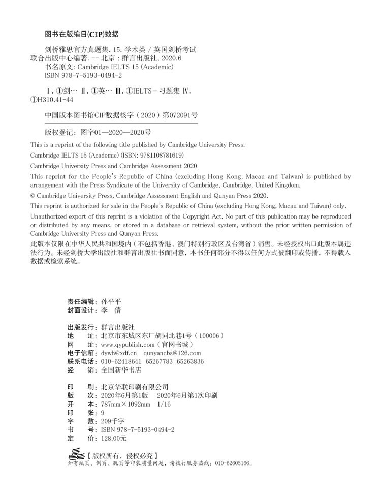 Ключом к подготовке любого теста является изучение реального вопроса: только понимая, что такое экзамен, вы знаете, как подготовиться.«Cambridge Ielts Официальная истинная коллекция 15 академическая категория» создается тестом IELTS. Это официально опубликованная информация о подготовке IELTS.Книга содержит 4 полных академических вопросов IELTS True Test и предоставляет ответы на упражнения и тексты для прослушивания.Кроме того, книга также включает в себя всеобъемлющее введение в различные типы вопросов, анализ системы оценки, принятой Экзаменационным комитетом Кембриджского университета, и богатые онлайн -ресурсы.Вся информация этой книги предоставлена Английским кафедрой оценки Экзаменационного комитета Кембриджского университета. Это незаменимый справочник в процессе подготовки академического и Иральда.