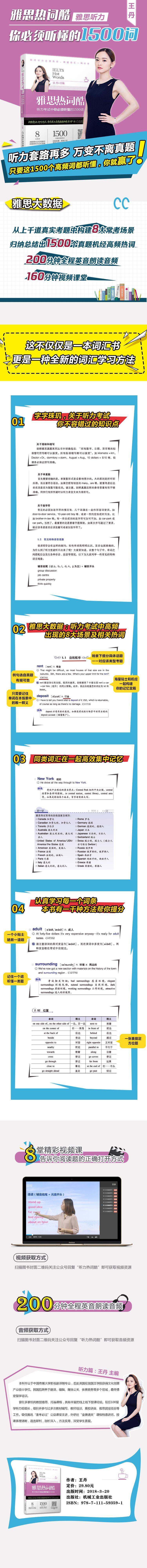 Словарный запас в книге в основном взят из вопросов аудирования Cambridge IELTS (обновлено до Jian12), и так называемая наша частная версия банка вопросов.“По машине”.Из этого огромного количества информации мы тщательно отобрали основную информацию для кандидатов.1500слово.