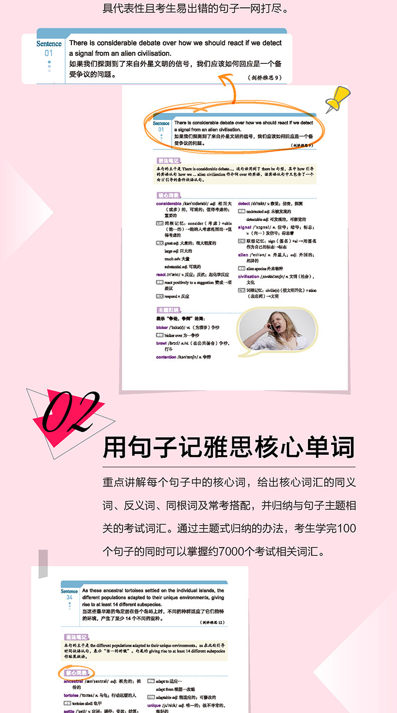 «100 предложений, запоминающих 7000 слов IELTS» через словарный запасные книги о предложениях, чтобы выучить предложения, слова и воспоминания, умно сочетаются с тестом IELTS.Книга выбирает 100 предложений из теста IELTS. Проанализируя грамматическую структуру и ключевой словарный запас предложения, чтобы обеспечить точное понимание кандидатов и овладеть ключевым словарями IELTS.Кроме того, вся книга начинается с предложений, расширяющих более 300 типов тем IELTS и больших словарных словарных путей*7000 IELTS посредством корреляции темы и индукции словарного запаса.Книга оснащена 170 полными иллюстрациями и представлена чисто положительным аудио -аудио. Читатели могут войти в нижнюю обложку, чтобы загрузить ссылку для загрузки аудиоданных бесплатно. Она также может сканировать нижний QR -код Audio для получения.