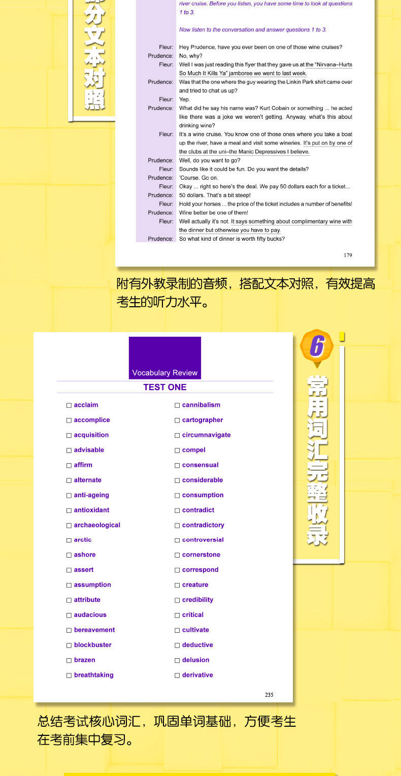 Эта книга содержит соответствующую информацию о стратегиях тестирования и подготовки IELTS и объясняет четыре отдельных элемента слушания, разговора, чтения и написания одного за другим, помогая кандидатам суммировать свои собственные навыки с высокой оценкой.Основываясь на реальных вопросах IELTS в качестве стандартных, 4 полных набора вопросов симуляции подготовлены, с сложностью и реальными вопросами.Каждый набор вопросов оснащен анализом чтения, текстом прослушивания и записями иностранных учителей, чтобы помочь кандидатам в полной мере использовать каждый набор упражнений.Кроме того, он предоставляет листы ответов для использования на формальном экзамене IELTS, имитации тестовых сценариев и помогают кандидатам практиковать навыки ответа.Подробный сборник из 8 примеров с высокой оценкой написания, обеспечивающих подлинное выражение языка и четкие идеи письма.Он включает в себя 4 набора реалистичных записей моделирования устных тестов, поэтому кандидаты могут использовать это, чтобы ознакомиться с процессом устного тестирования.Книга также прилагается основной словарный запас, так что кандидаты могут концентрироваться и консолидировать свой словарный фонд перед экзаменом.