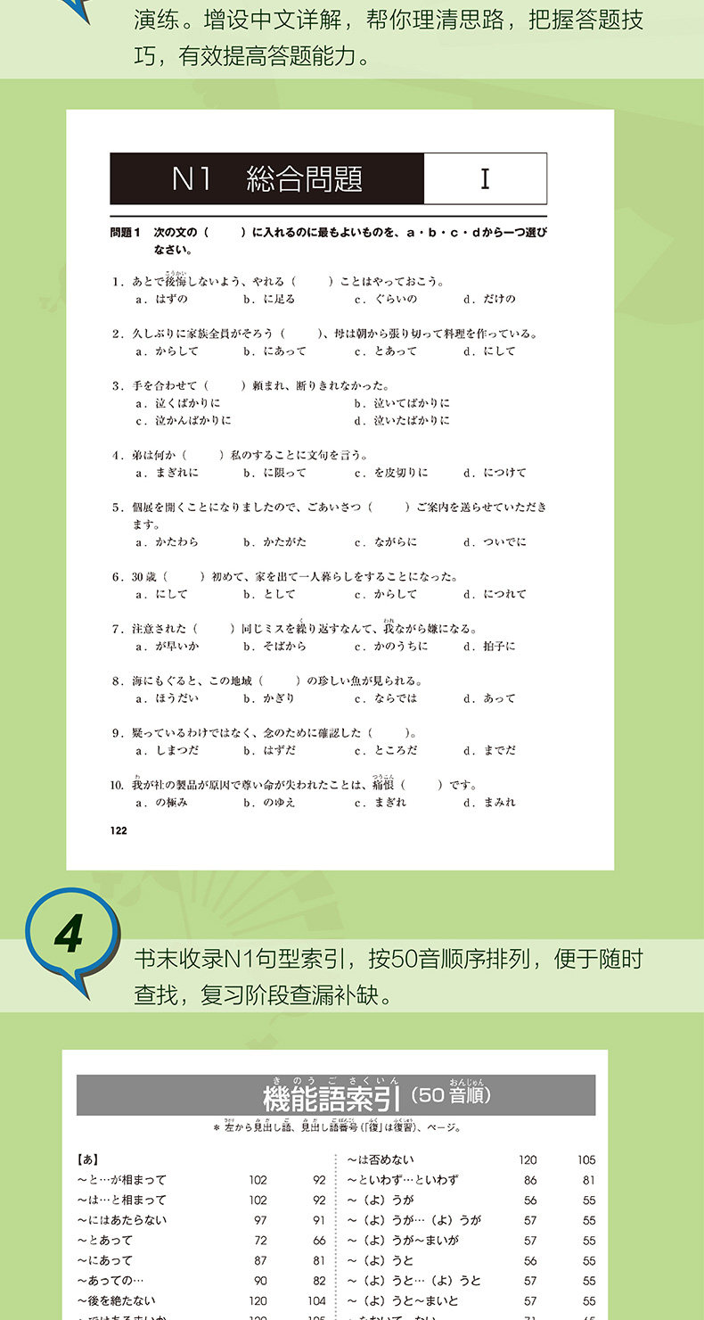 1О порядке грамматики (легко&Рарр;Он полностью учитывает, является ли легко понять каждый шаблон предложения и его важность.★ тем сложнее, тем сложнее.2О примере предложенийМы полностью рассмотрим такие факторы, как случаи, когда часто используется каждый шаблон предложения и словарный запас используется вместе.Целью высокочастотного словаря на экзамене N1.Объясните конкретное значение и абстрактное значение моделей предложений от мелкого до глубокого.Примеры предложений в книге очень применимы, и большинство предложений могут использоваться во многих случаях, просто заменив слова.3Чтобы помочь понять смысл моделей предложенийПроект обзора включает в себя официальные термины (изучены средними школами на уровнях N2 до N5).В шаблонах предложений, содержащих глаголы, первоначальное значение и использование глагола специально добавлены.4Чтобы помочь запомнить морфологические изменения и методы продолжения предложений.Упражнения с различными типами вопросов были созданы, чтобы помочь кандидатам запомнить морфологические изменения и методы продолжения моделей предложения.→&Ldquo; упражнение” в середине&Ldquo; Вопрос о вспомогательных словах”“ проблема использования&rdquo“ небольшой тест (まとあうスト)&Вопросы I и II в RDQUO;5Запомните, слушаяВключена полная запись книги, которая содержит репрезентативные примеры каждого значения каждого шаблона предложения.Если вы хотите запомнить шаблон предложения, вы не можете просто смотреть своими глазами, но также открыть уши, чтобы слушать, писать вручную и говорить на практике. Вы можете учиться эффективно.Обучение грамматике - это то же самое, что запоминание словаря. Мастерство.