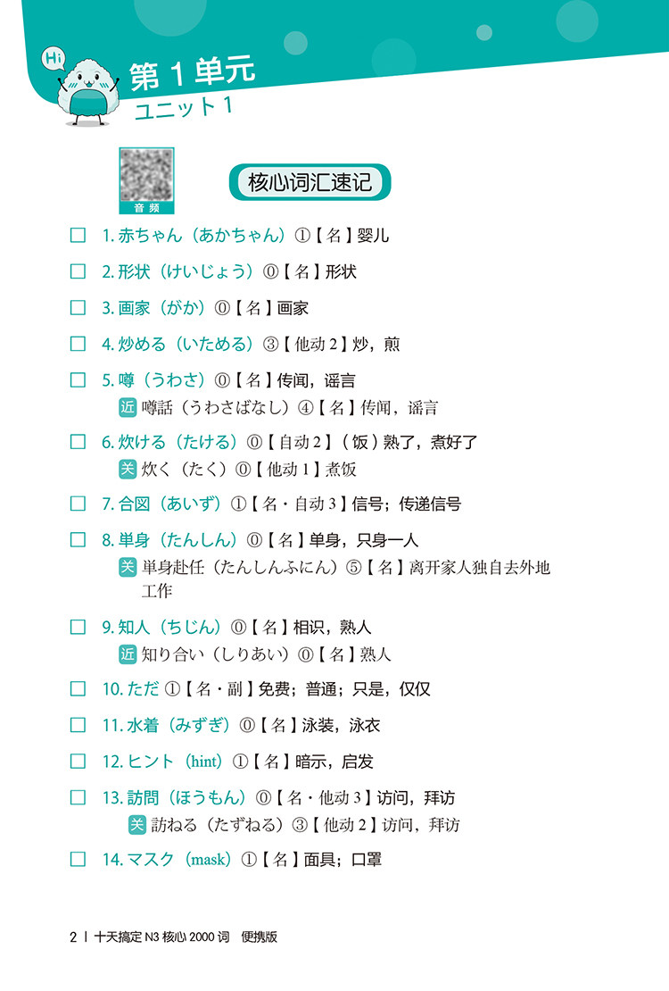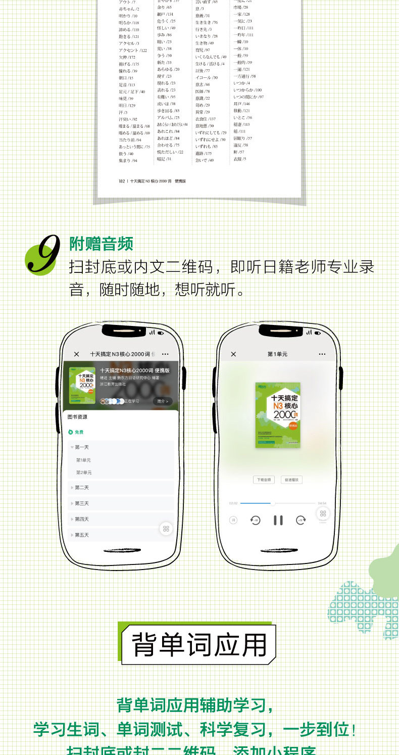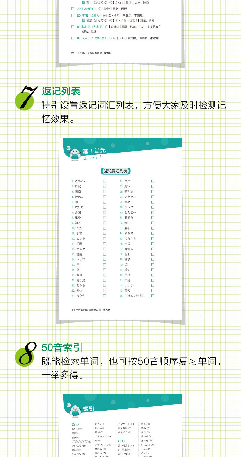 «Возьмите N3 Core 2000 слов за десять дней» выбирает N3 Реальные вопросы с высокой частотой 2000 слов, точно выбирают слова; и основные значения словаря N3, уменьшить бремя памяти;“ Список лексики возврата&Rdquo;, удобно для всех, чтобы обнаружить эффект памяти во времени.