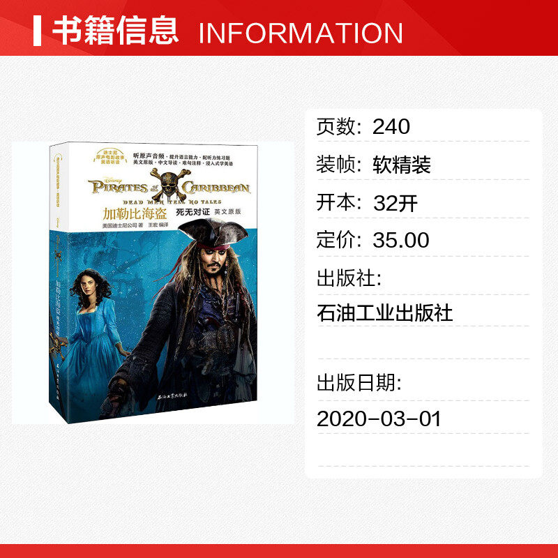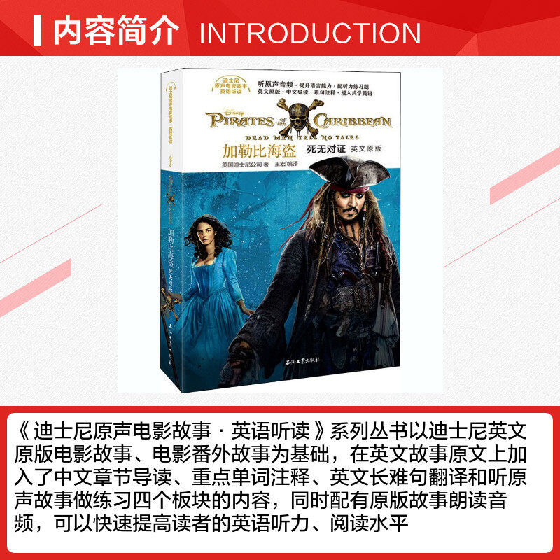 «История оригинального фильма Диснея»·Серия книг «Аудирование и чтение по-английски» основана на оригинальных английских кинорассказах Диснея и дополнительных рассказах к фильмам. К оригинальным английским рассказам он добавляет четыре раздела с выдержками из глав на китайском языке, аннотации к ключевым словам, перевод длинных и сложных английских предложений, а также упражнения для прослушивания оригинальных историй. Он также поставляется с оригинальным звуком для чтения рассказов, который может быстро улучшить уровень слушания и чтения читателей на английском языке.«Пираты Карибского моря: Мертвецы не рассказывают сказки» — пятый фильм из серии приключенческих фэнтези-фильмов «Пираты Карибского моря», выпущенной Disney Pictures. В фильме рассказывается приключенческая история капитана Джека Воробья и его команды, которые отправились в своих целях найти трезубец легендарного Посейдона.