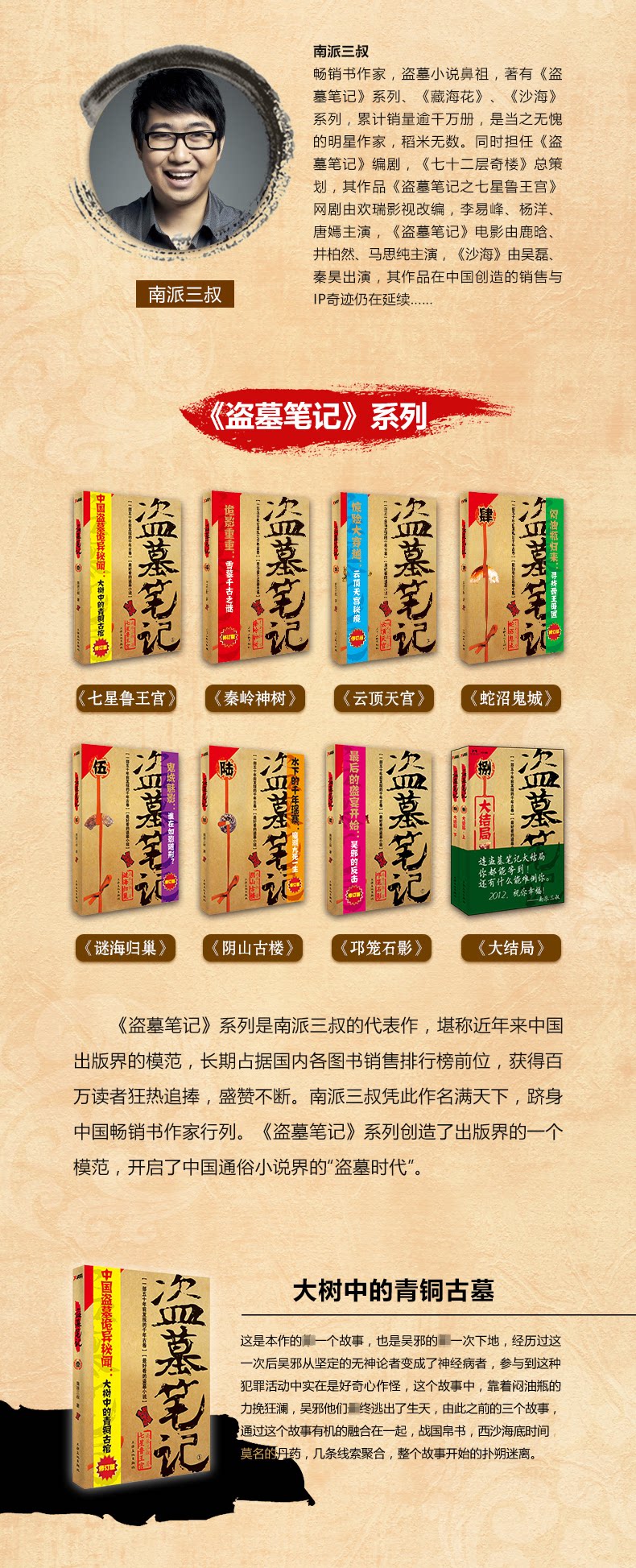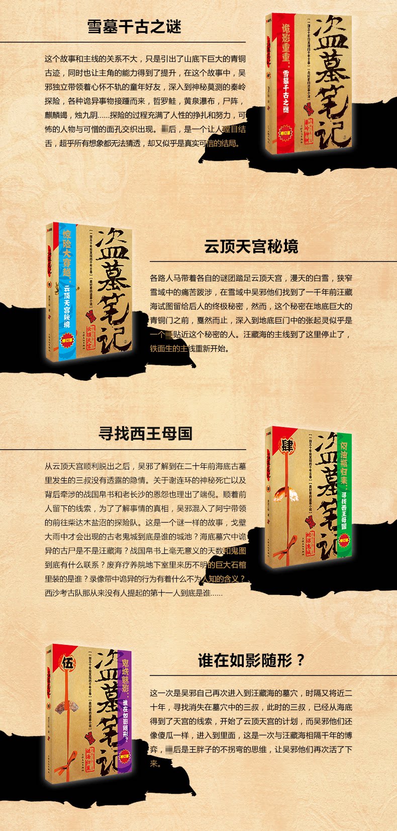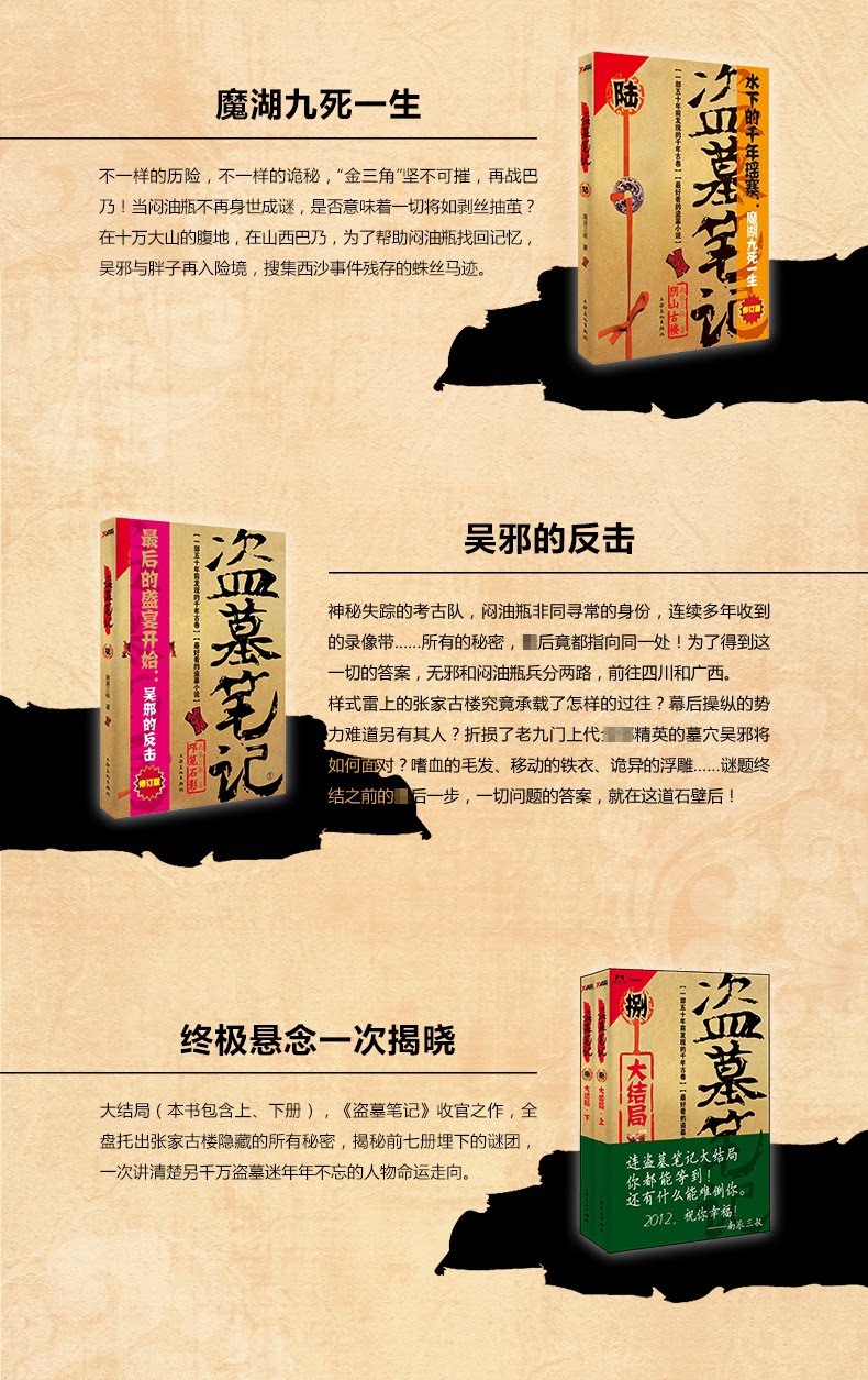 «Ограбление гробницы (1-8) (9 томов) (издание шестого годовщины)»: включает в себя «Заметки о грабеже могилы .1» (дворец Qixinglu), «Примечания по гробнице. 2» (Qinling Shenshu), «Примечания по ограблению гробницы)» (Genting Tiangong), «Записки с могилом. Примечания по ограблению .7 "(《、 邛 邛)," Записка по ограблению гробницы .8. "" Часть "," Tomb Raider .8. Ниже ".