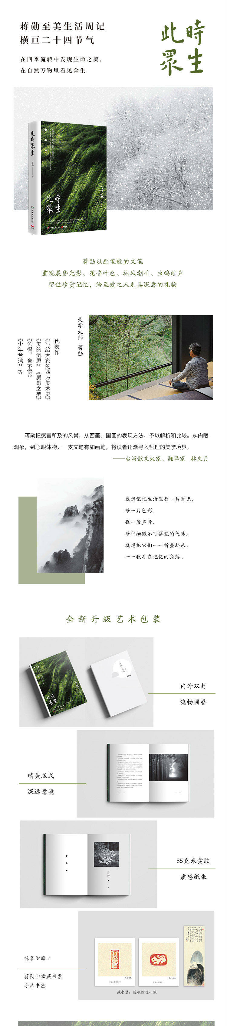 Прилежным в распространении эстетики и объяснении публике на простом языке, чтобы объяснить, какой стиль и вкус Цзян Сюн, есть очень деликатная книга.Эта книга получает в общей сложности 50 прозы, каждая из которых составляет около 1200 слов, начиная с 23 года, и заканчивается в мае следующего года.Всего год, двадцать четыре солнечных термина, штрафы недели и начало стали этими «все существа в это время».