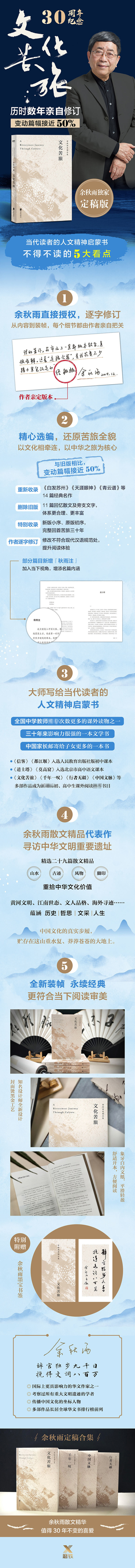 «Культурные горькие путешествия» - это первая коллекция культурной прозы Yu Qiuyu, которая открыла популярность культурных эссе, и она хорошо продается.Тема всей книги состоит в том, чтобы исследовать контекст китайской культуры с пейзажами, чтобы искать культурные души и истинное значение жизни.Откройте эту книгу и следуйте за автором, чтобы искать важные места китайской цивилизации. От природных ландшафтов до гуманистических ландшафтов, это похоже на начало путешествия души. Через статуи древних и современных объектов, глубокий и пустынный истории найден На ручке, и удары указывают на культуру для культуры. Личность и культурная совесть показывают стремление к истории, культуре и жизни.Эта книга представляет собой индивидуальную версию «культурного горького», которая пересматривается автором в течение нескольких лет.По сравнению со старой версией, пространство изменений составляет около 50%. Принимая во Китайское путешествие в качестве основного, 14 классических шедевров, таких как «белые волосы сучжоу», «конец конца глаз» и «Qingyunpu» . Система более разумная и богаче.Специально включена новая версия небольшого предисловия и оригинальная предварительная последовательность, а первая горькая бригада будет завершена в течение 30 лет.«Примечание Qiuyu» добавляется в некоторые статьи, добавляя текущую перспективу, которая представляет собой гуманистическую книгу духовного просветления, которую стоит прочитать.