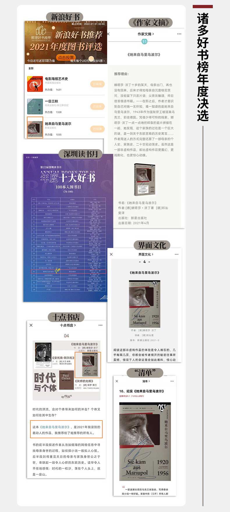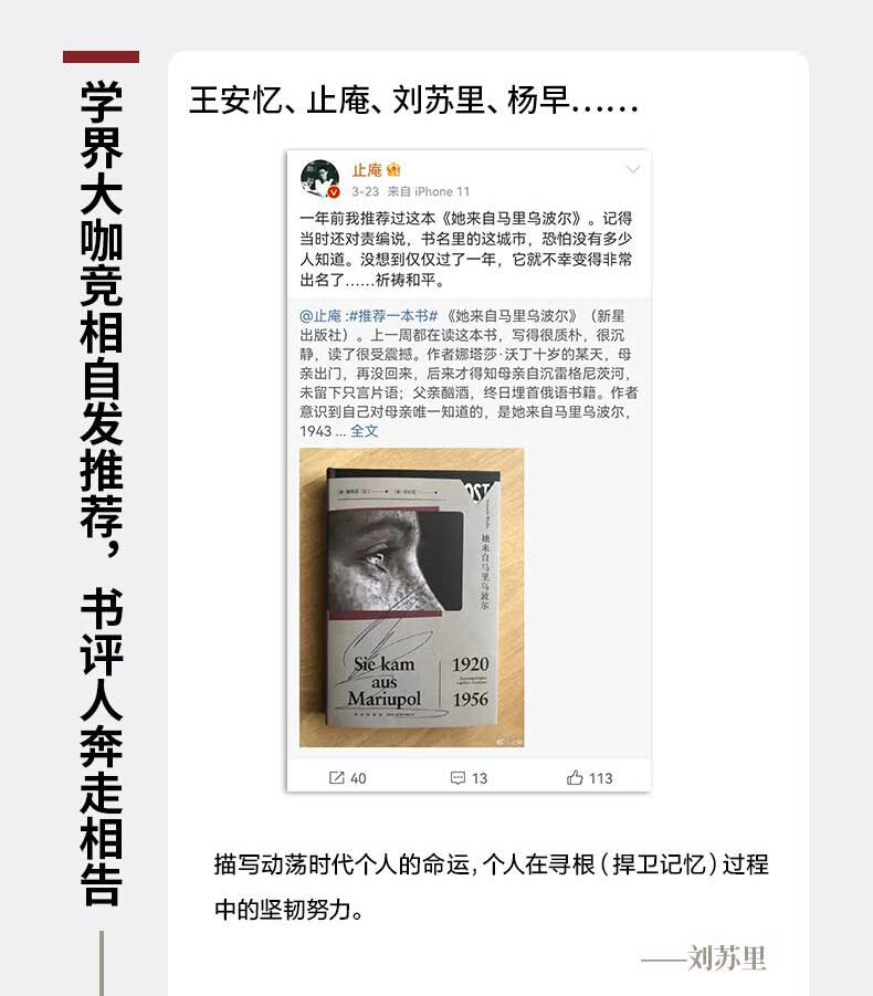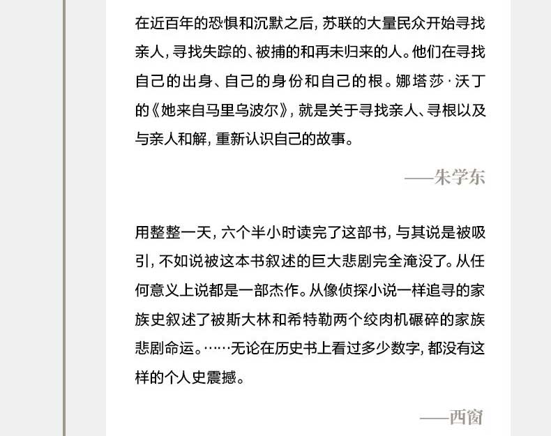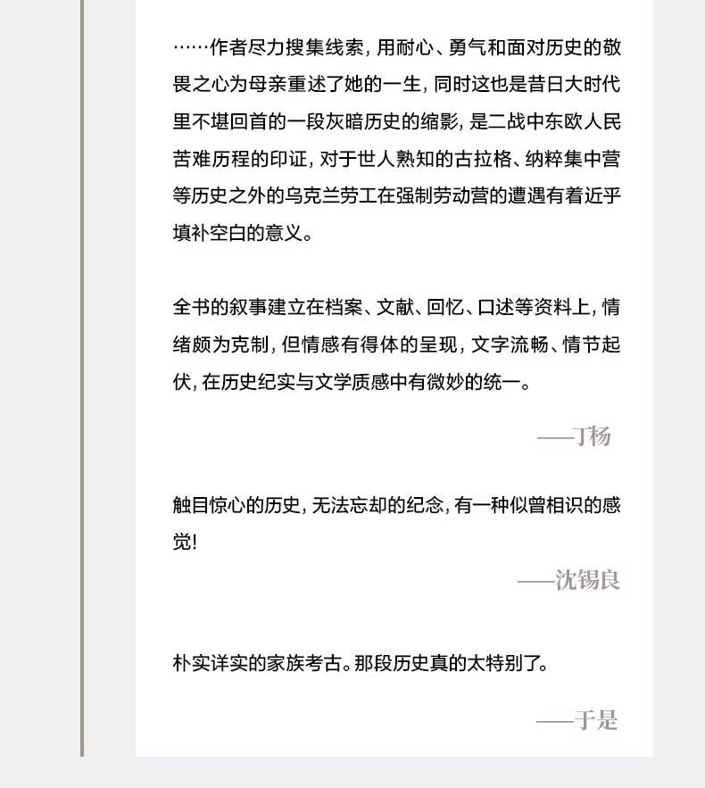 Однажды, когда Наташе Уордин было десять лет, ее мать ушла и не вернулась. Позже она узнала, что ее мать утонула в реке Регниц, не оставив ни единого слова; ее отец был алкоголиком и целыми днями уткнулся в русские книги.——После этого автор понял, что ничего о ней не знает, кроме того, что она была из Мариуполя и была депортирована из Украины в Германию в качестве принудительных работ в 1943 году.Имея мало улик, Наташа Уординг по крупицам собирала обломки воедино. Она обнаружила, что прошлое семьи было огромной загадкой и исторической аллегорией страданий Восточной Европы.……Автор очаровательным способом полностью восстанавливает личную историю матери, семейную историю и бурную историю ХХ века.Хотя это научно-популярное произведение, оно более волшебное, драматичное и захватывающее, чем художественная литература.