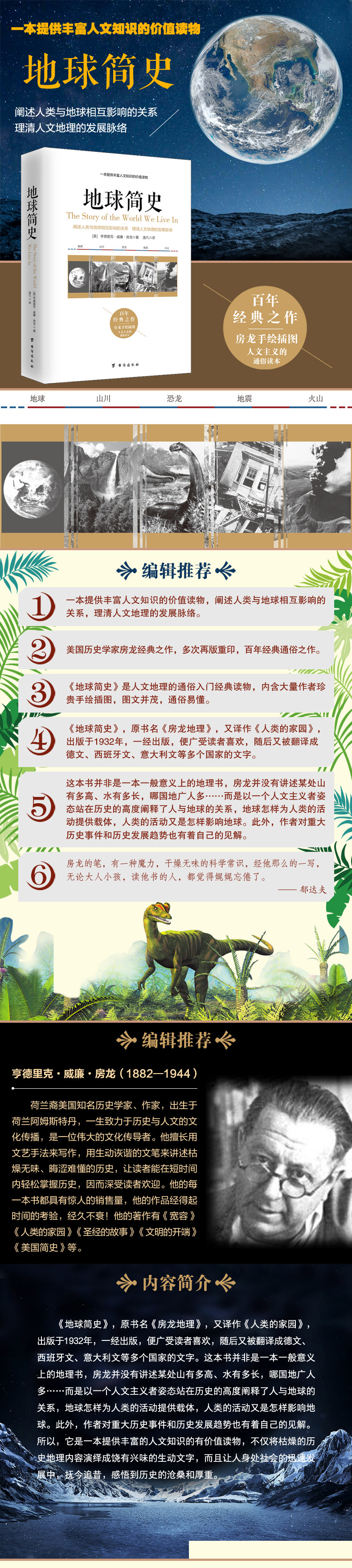 «Краткая история Земли», первоначально озаглавленная «География фангзавра», а также переведенная как «Дом человечества», была опубликована в 1932 году.После публикации она получила широкую любовь читателей и позже была переведена на немецкий, испанский, итальянский и другие языки. Эта книга не является книгой по географии в общем смысле. Фан Лун не сказал, насколько высоки горы, какова длина воды или в какой стране больше всего земли и больше всего людей.……Вместо этого он объясняет отношения между человеком и землей с исторической точки зрения как гуманист, как земля обеспечивает носитель человеческой деятельности и как деятельность человека влияет на землю.Кроме того, у автора имеется и собственное мнение о важнейших исторических событиях и тенденциях исторического развития. Таким образом, это ценное чтение, которое дает богатые гуманистические знания.Он не только интерпретирует скучное историческое и географическое содержание интересными и яркими словами, но и позволяет людям погрузиться в стремительное развитие общества, оглянуться на настоящее и прошлое, ощутить перипетии и тяжесть истории.