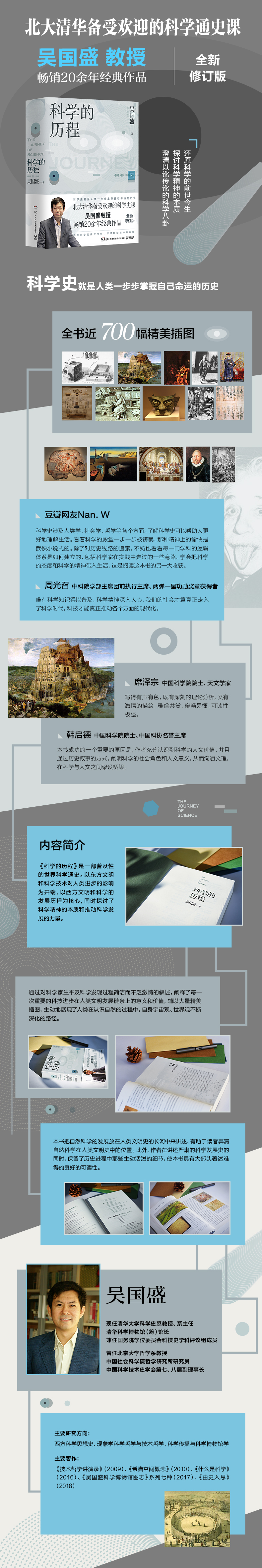 [ 《科学的历程》是一部普及性的世界科学通史。以东方文明和科学技术对人类进步的影响为开端,以西方文明和科学的发展历程为核心,同时探讨了科学精神的本质和推动科学发展的力量。通过对科学家生平及科学发现过程简洁而不乏激情的叙述,阐释了每一次重要的科技进步在人类文明发展链条上的意义和价值,辅以大量精美插图,生动地展现了人类在认识自然的过程中,自身宇宙观、世界观不断深化的路径。本书把自然科学的发展放在人类文明史的长河中来讲述,有助于读者弄清自然科学在人类文明史中的位置。此外,作者在讲述严肃的科学发展史的同时,保留了历史进程中那些生动活泼的细节,使本书具有大部头著述难得的良好的可读性。 ]