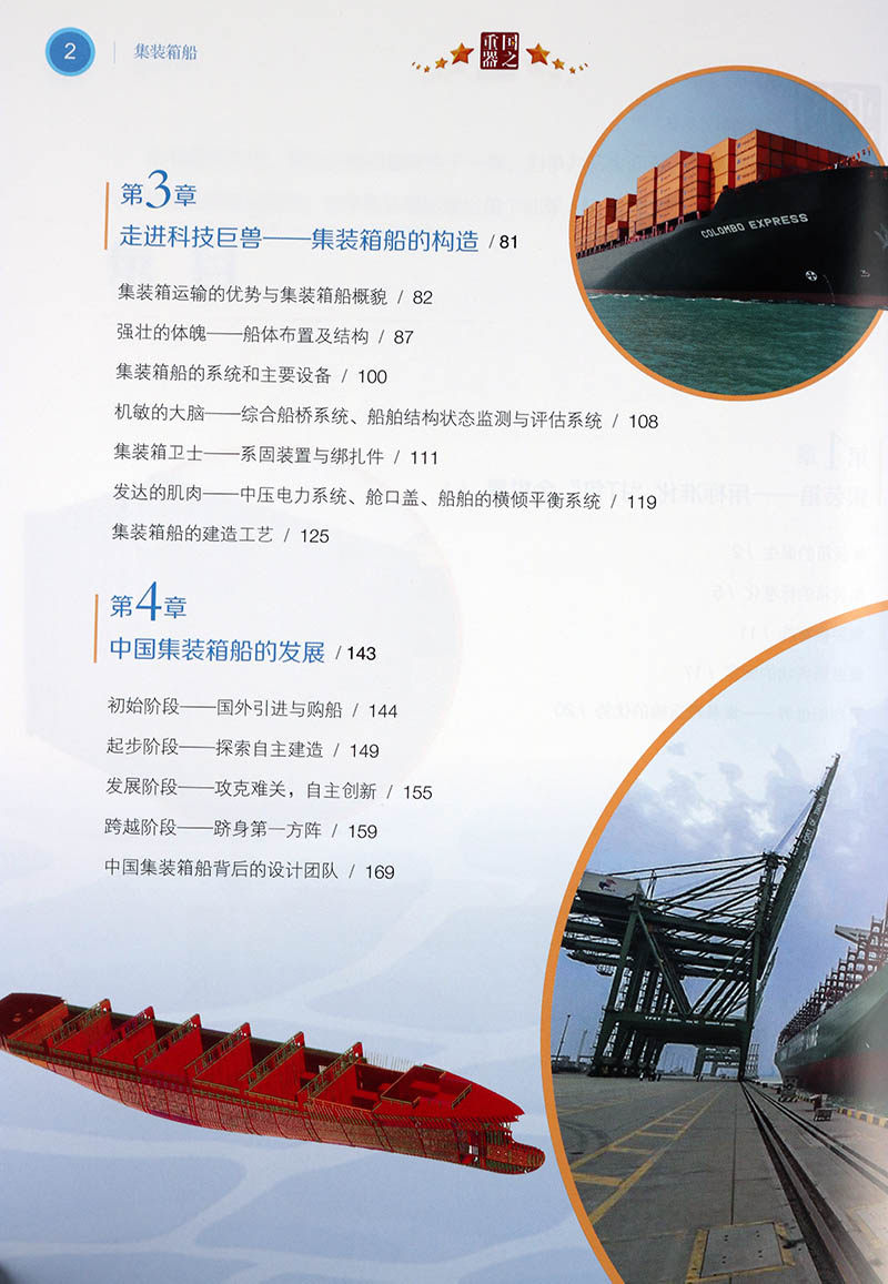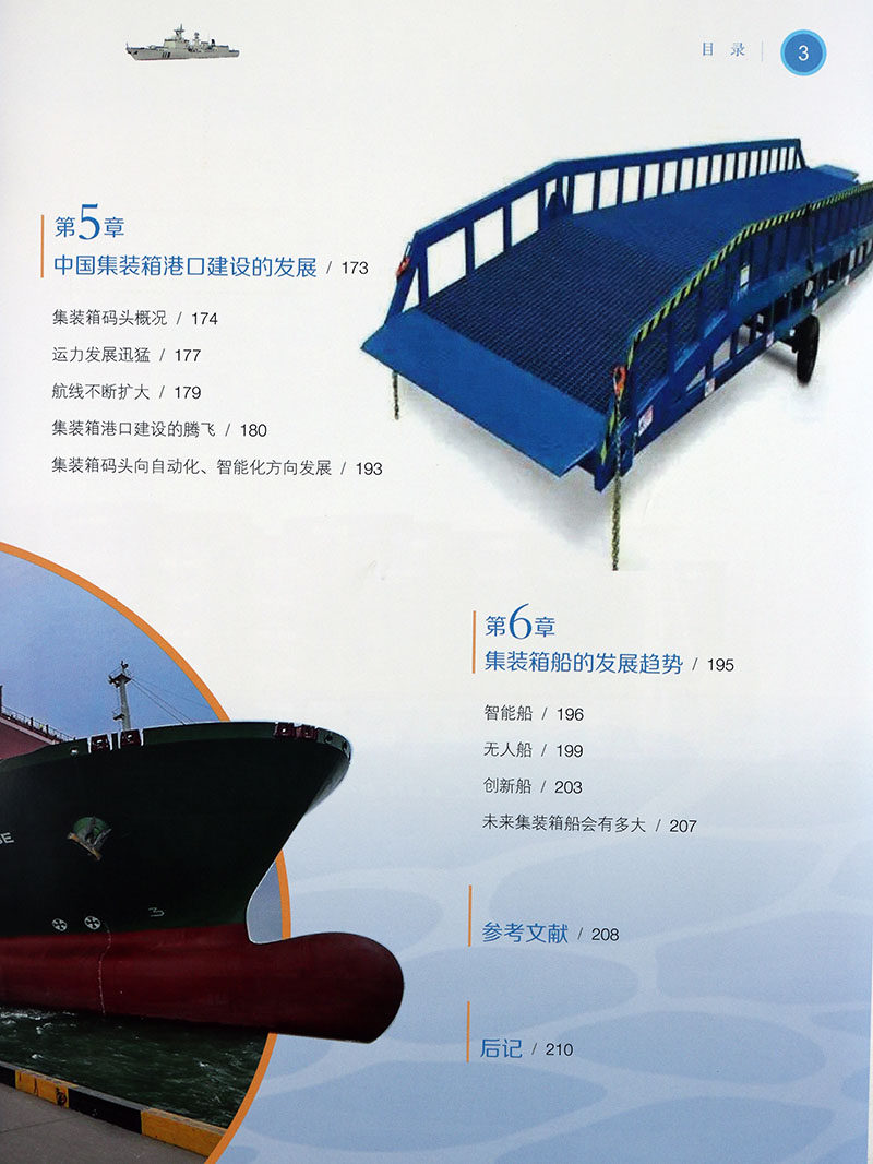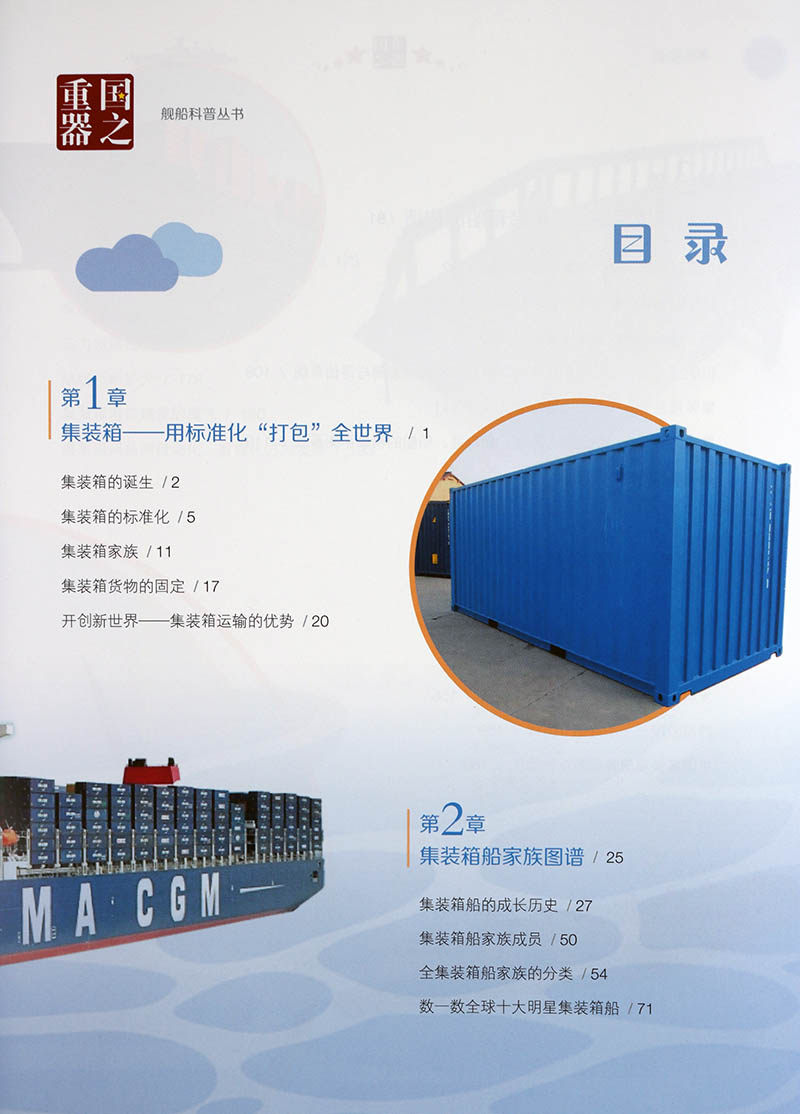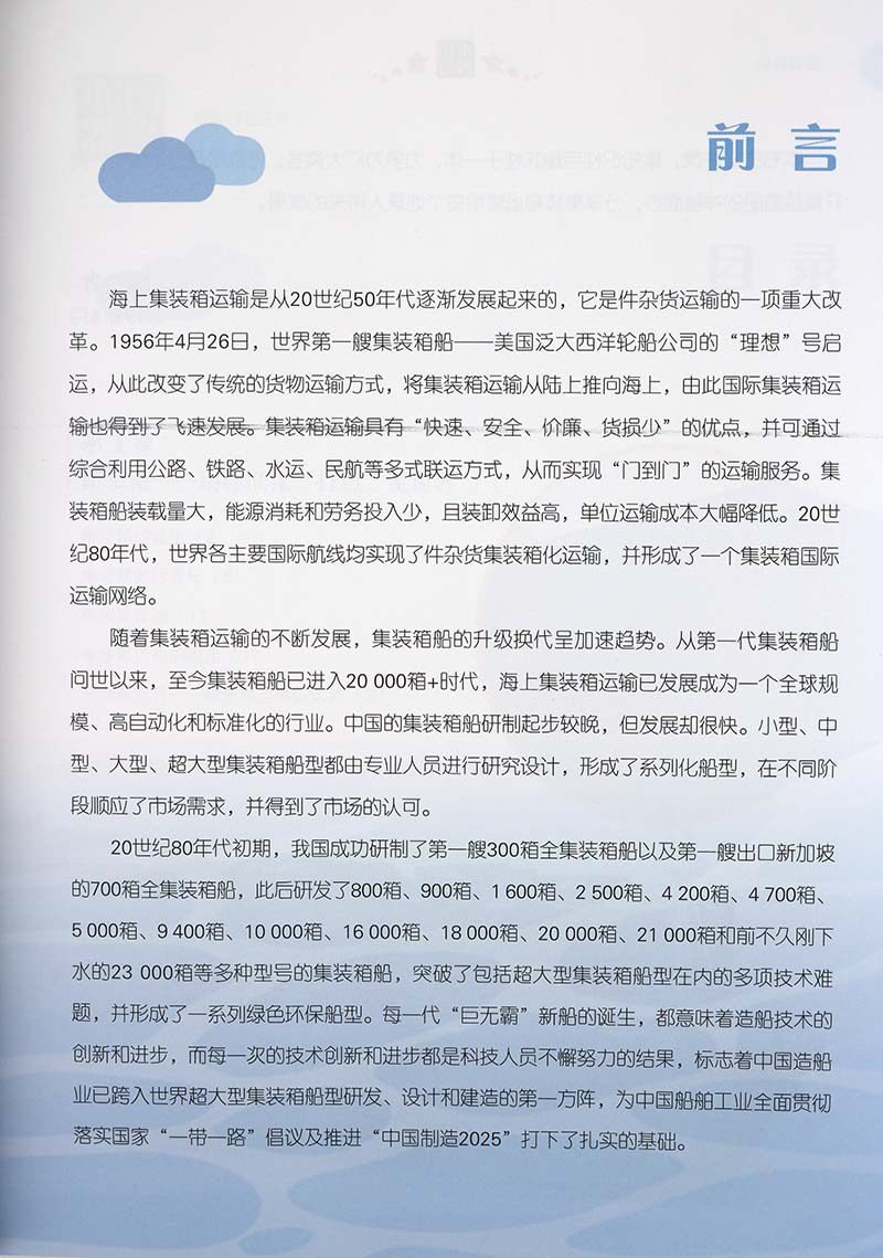 Эта книга в основном начинается с исторического происхождения контейнеровозов, рассказывая о происхождении контейнеров, появлении контейнеровозов и о том, как контейнеры изменили мир; знакомит с историей развития контейнеровозов, концепцией проектирования контейнеровозов и воплощением эффекта масштаба на контейнеровозах; поясняется технология строительства контейнеровозов и процесс строительства контейнеровоза водоизмещением 20 000 тонн;он показывает большие достижения, достигнутые в проектировании и строительстве китайских контейнеровозов с нуля, а также начало строительства портовых терминалов.