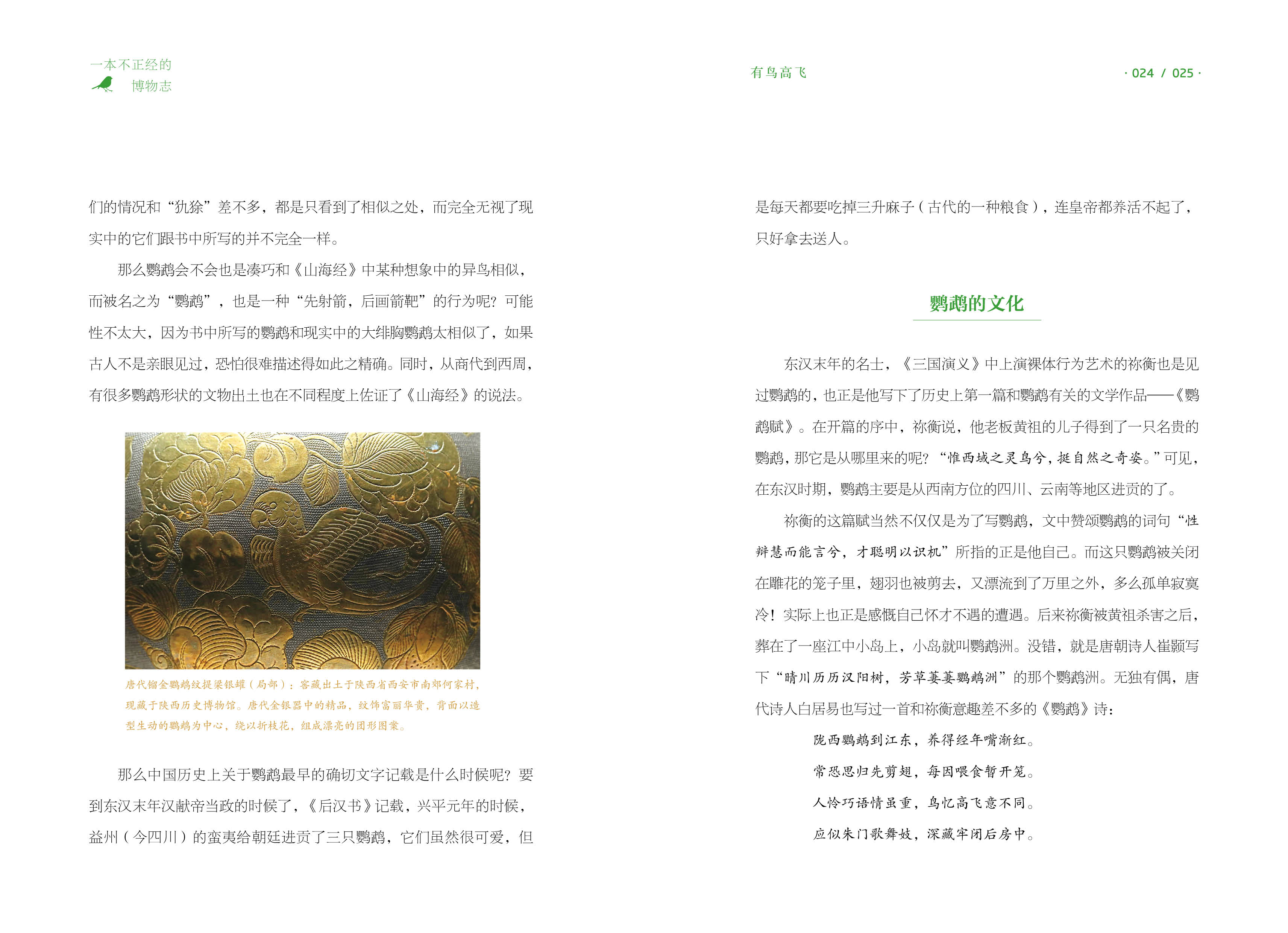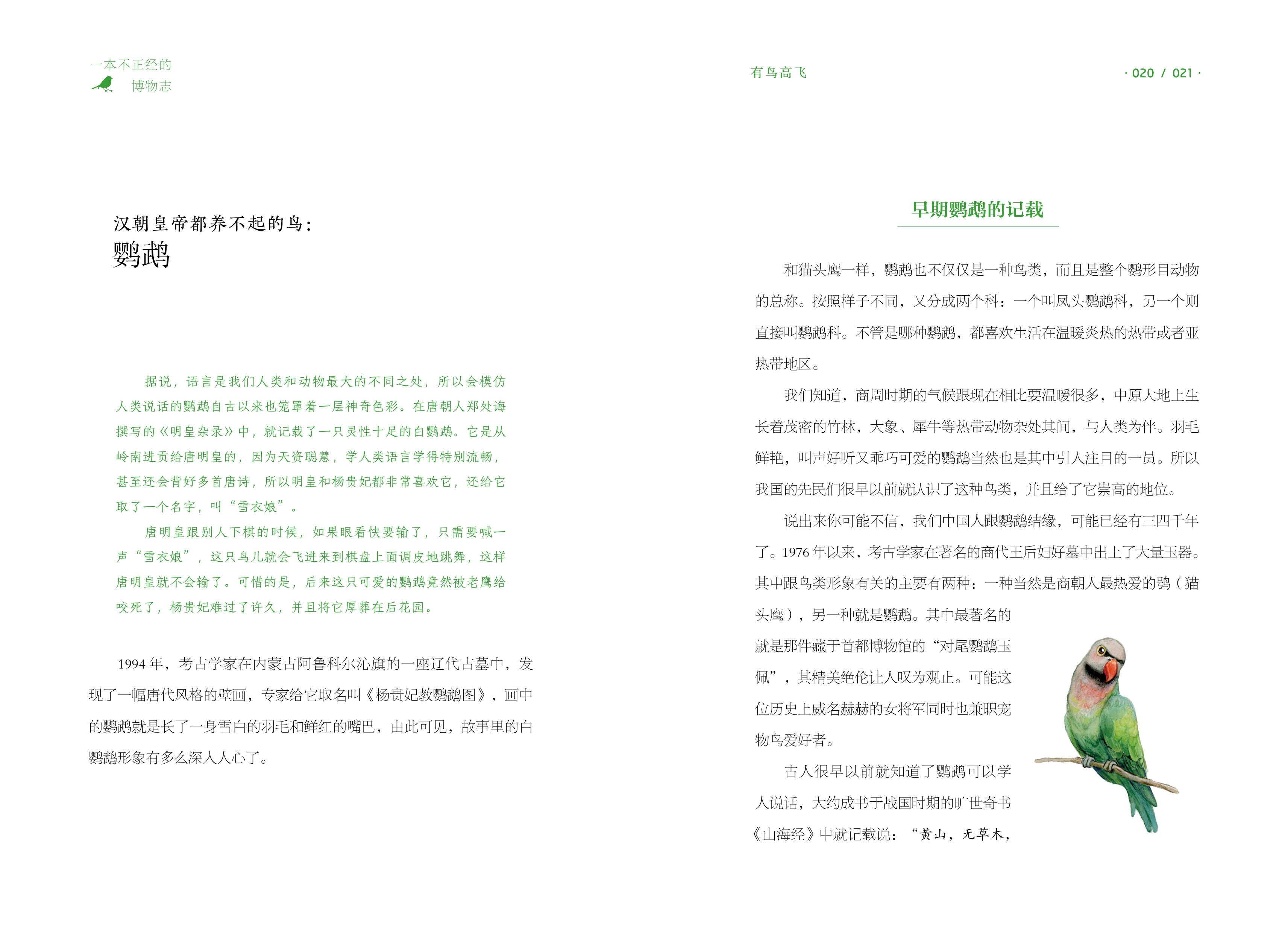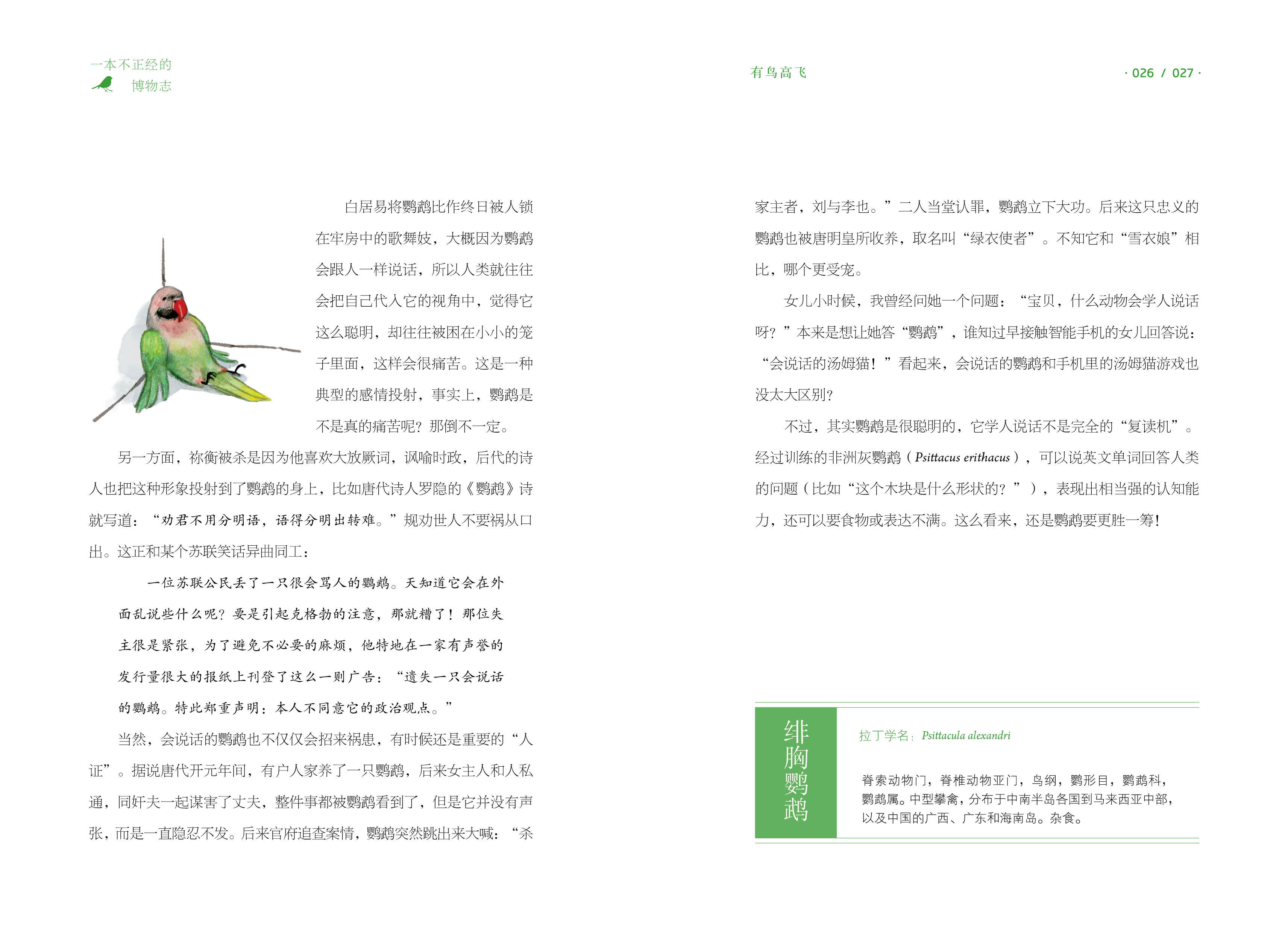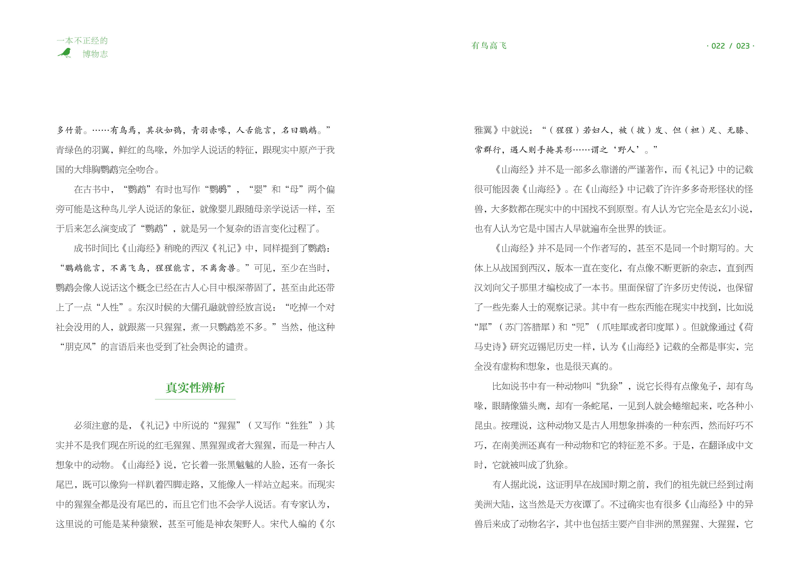 Автор с юмором по языку, ссылаясь на классику, от древних стихов до популярных научных исследований сегодня, рассказывая истории этих животных и растений: совы были стигматизированы, что оказалось связанным с нападением короля Ву на торговцев;Попугаи были слишком съедобными, и император не мог позволить себе поднять их; Легендарный прототип Нувы оказался лягушкой; Зуи после смерти миссис Синь Чжуй; Ворона, которая считалась плохим предзнаменованием, была благоприятной вещей.……