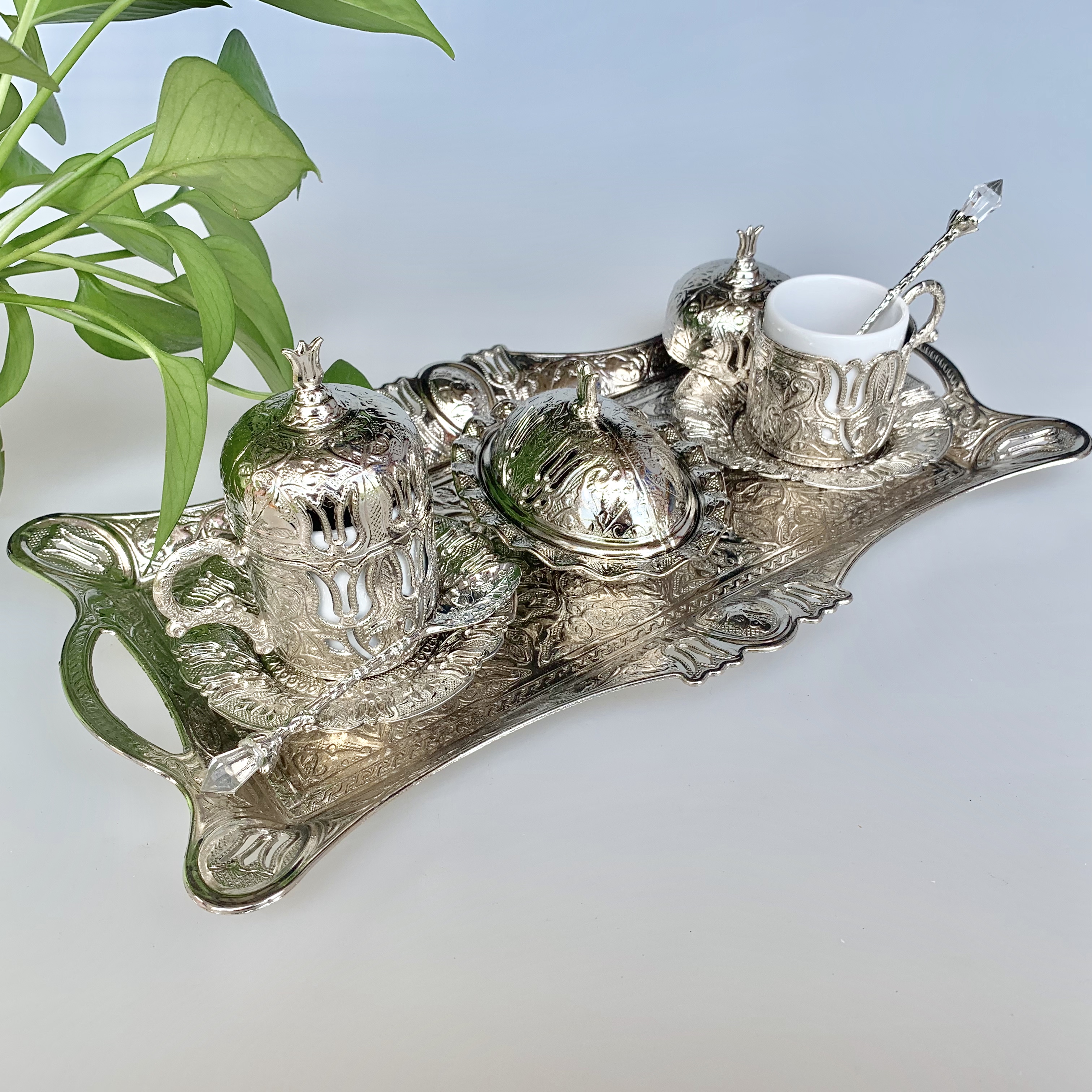 В том числе: двойной квадратный лоток тюльпана+два набора чашек с серебряными кофейными чашками тюльпана+тарелка для жвачки с тюльпаной+две кофейные ложки+один 6 серебряный кофейник