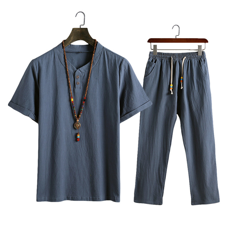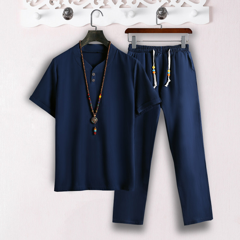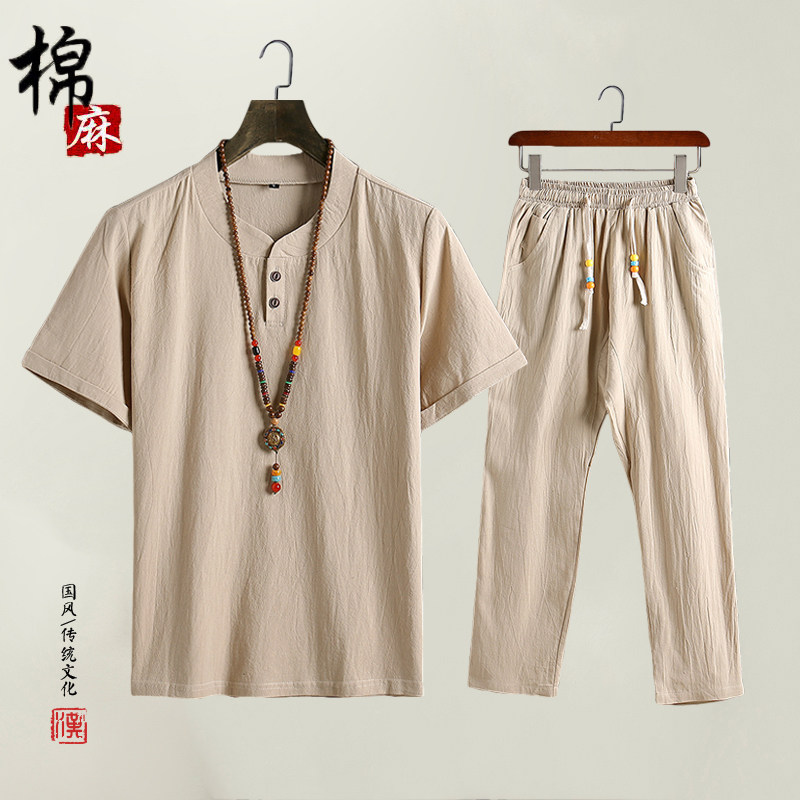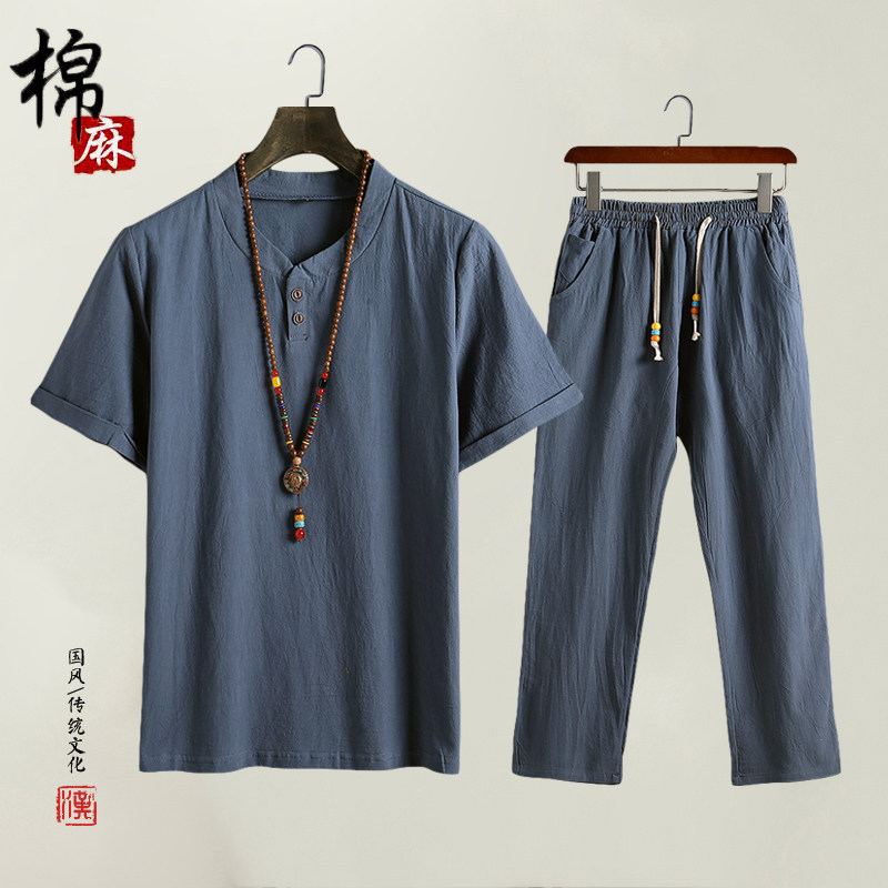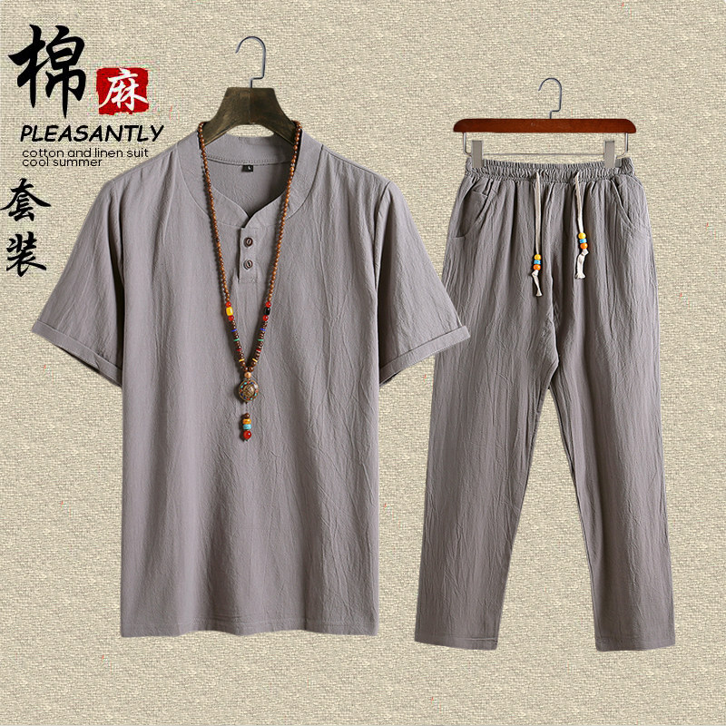 Мужская летняя одежда, футболка с коротким рукавом, комплект для пожилых людей, для мужчины среднего возраста, из хлопка и льна, 40-50 лет