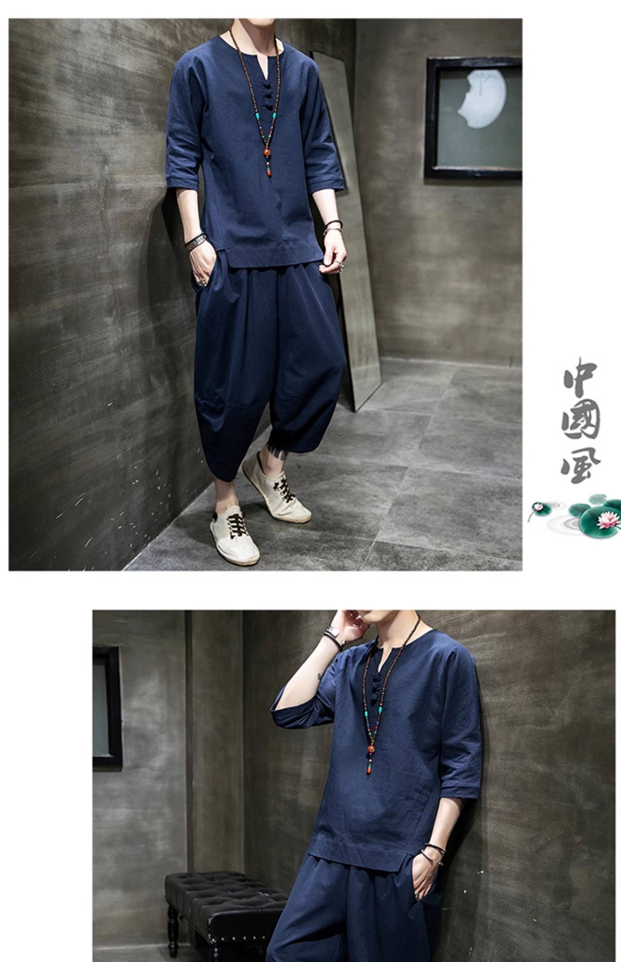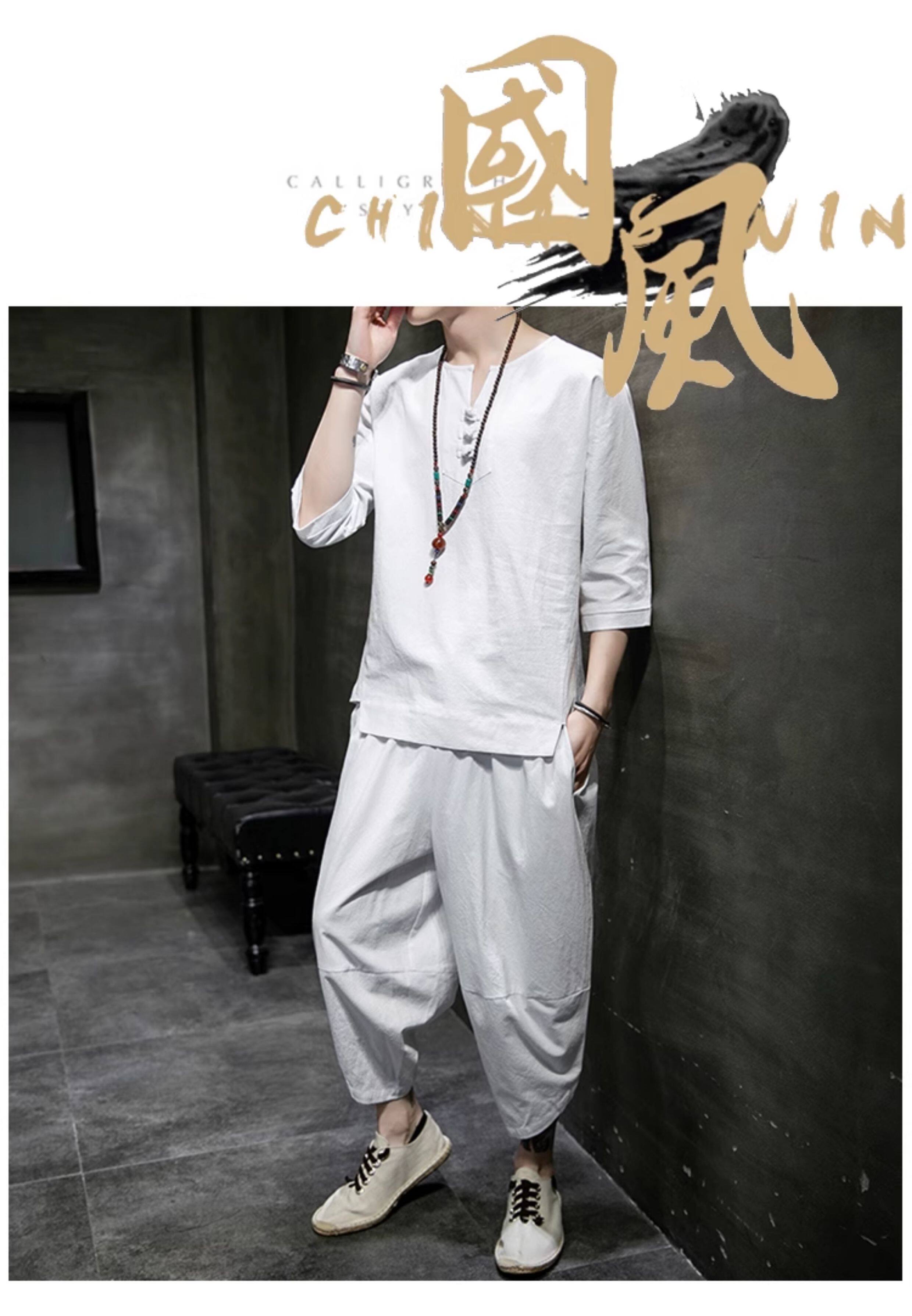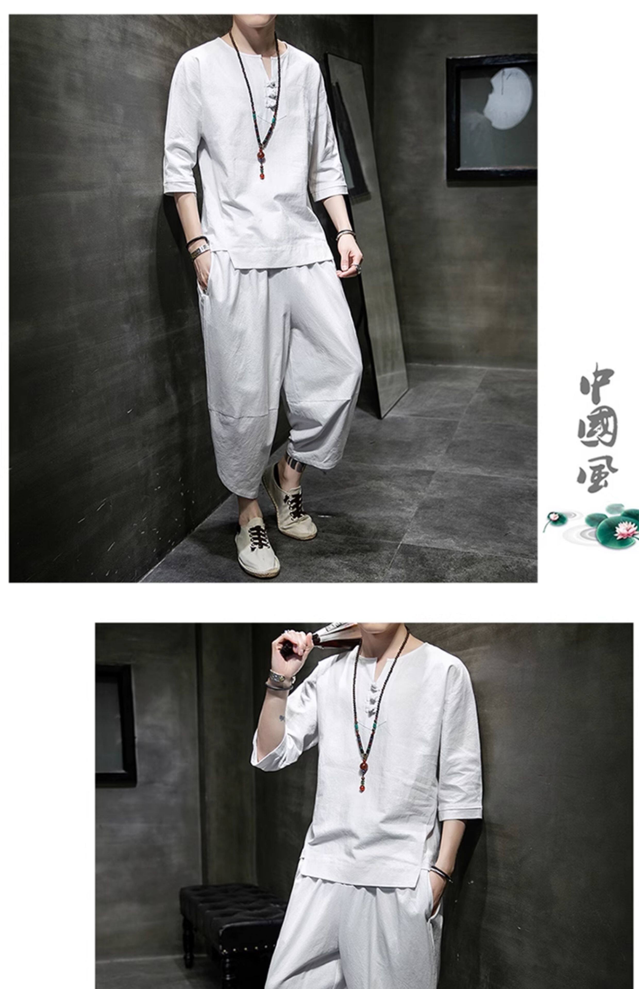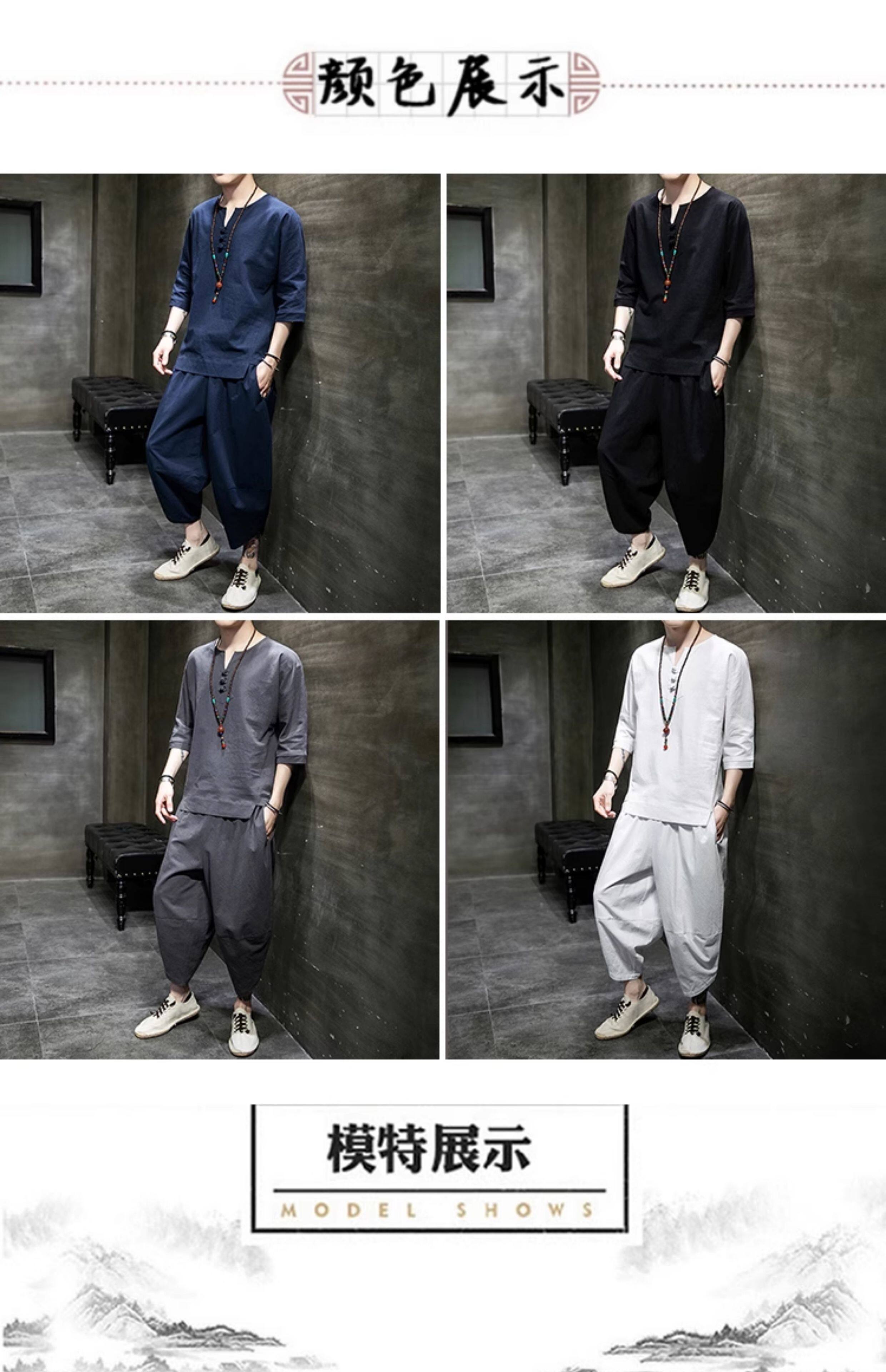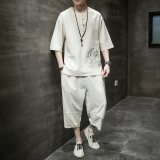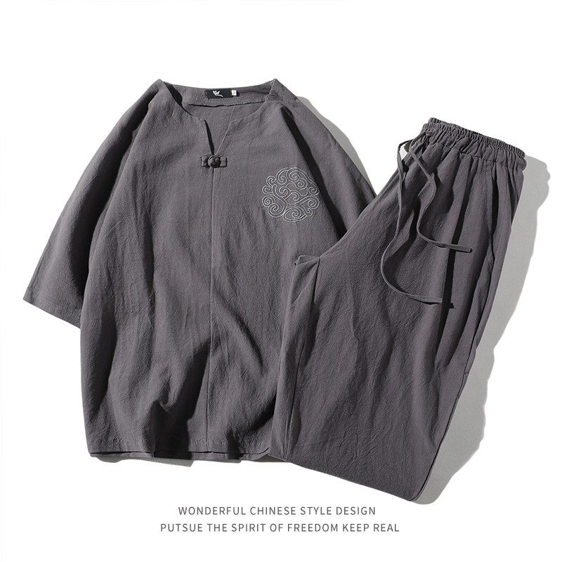 Футболка, летний комплект, китайский стиль, из хлопка и льна, короткий рукав